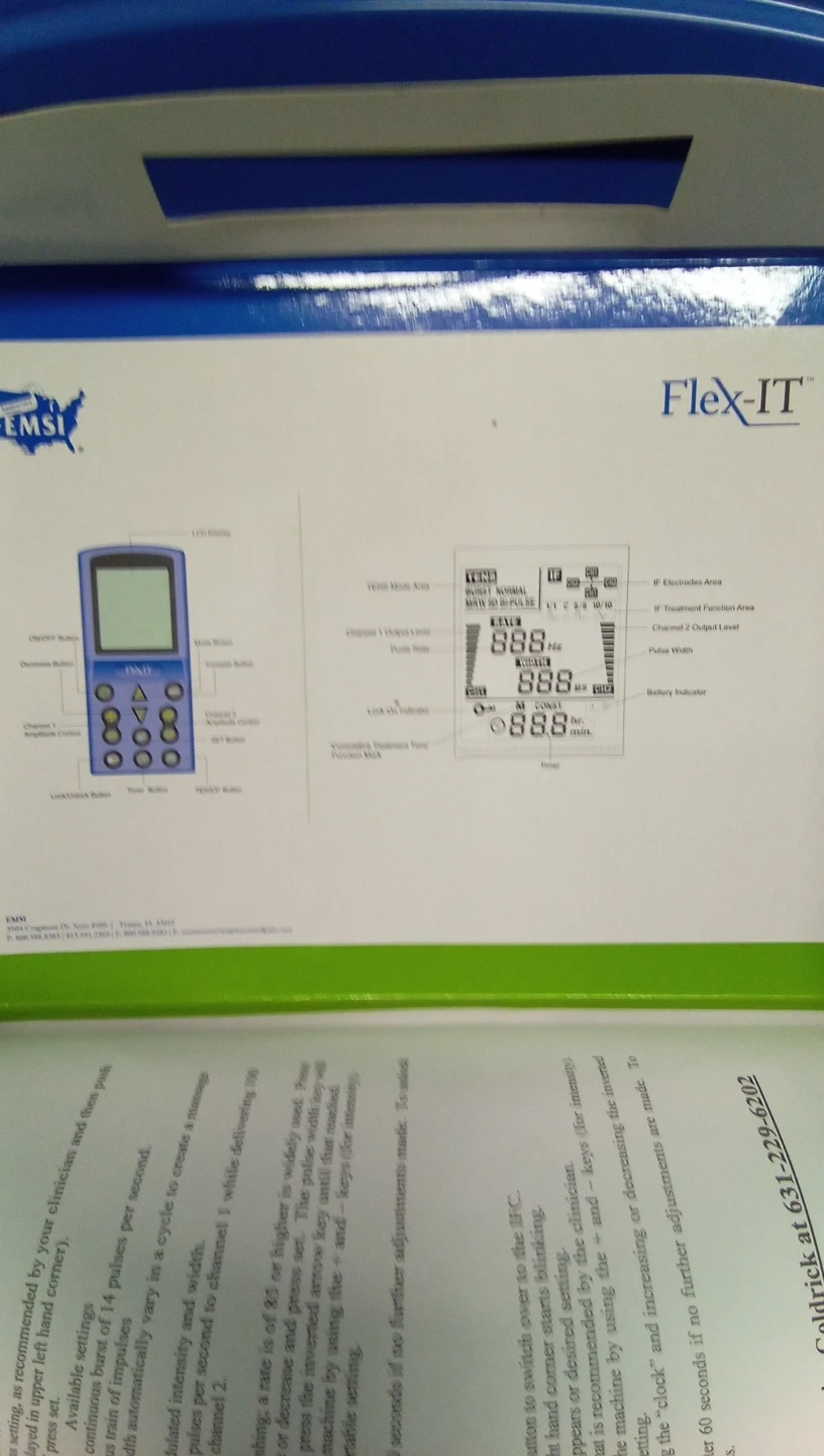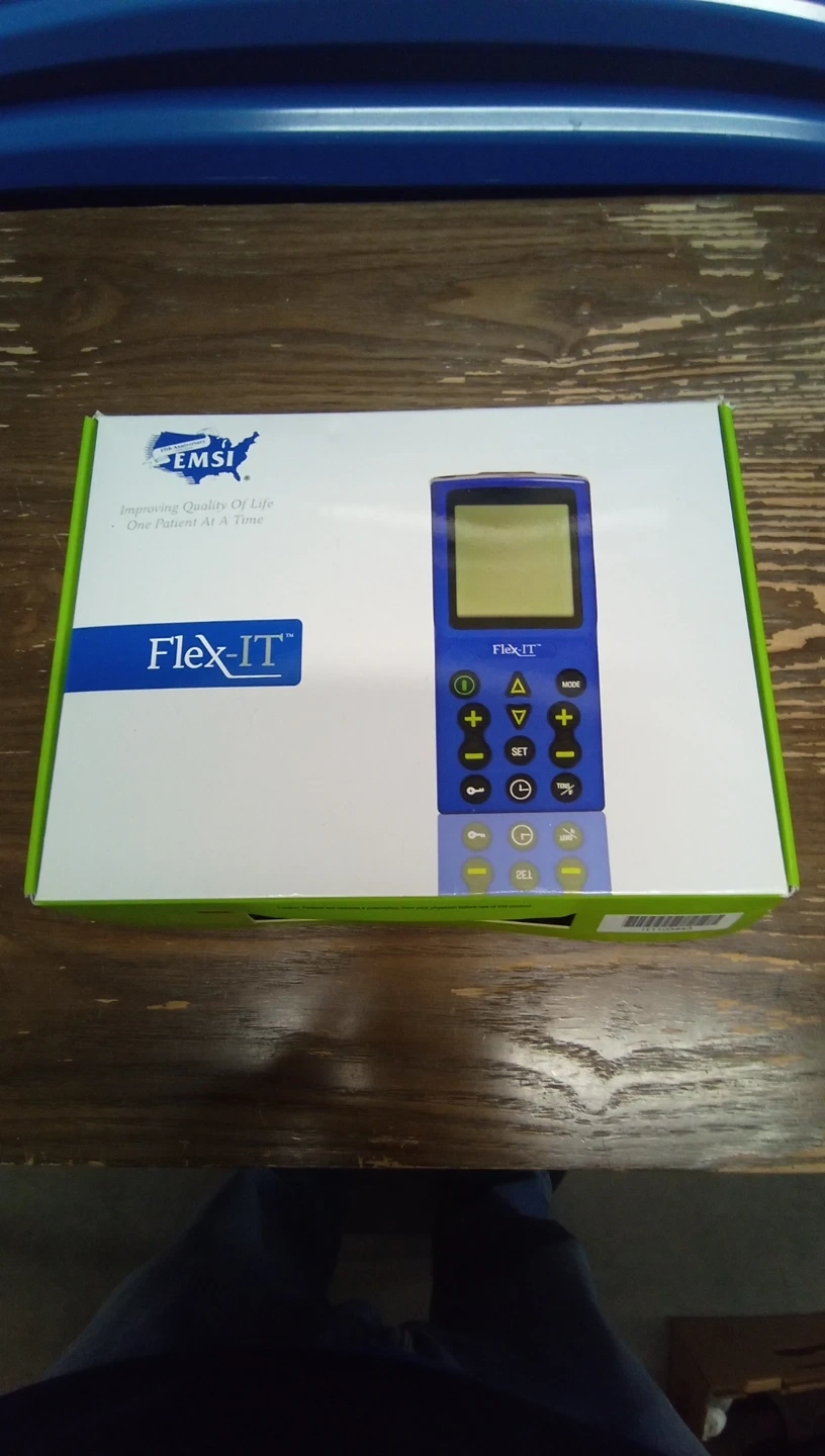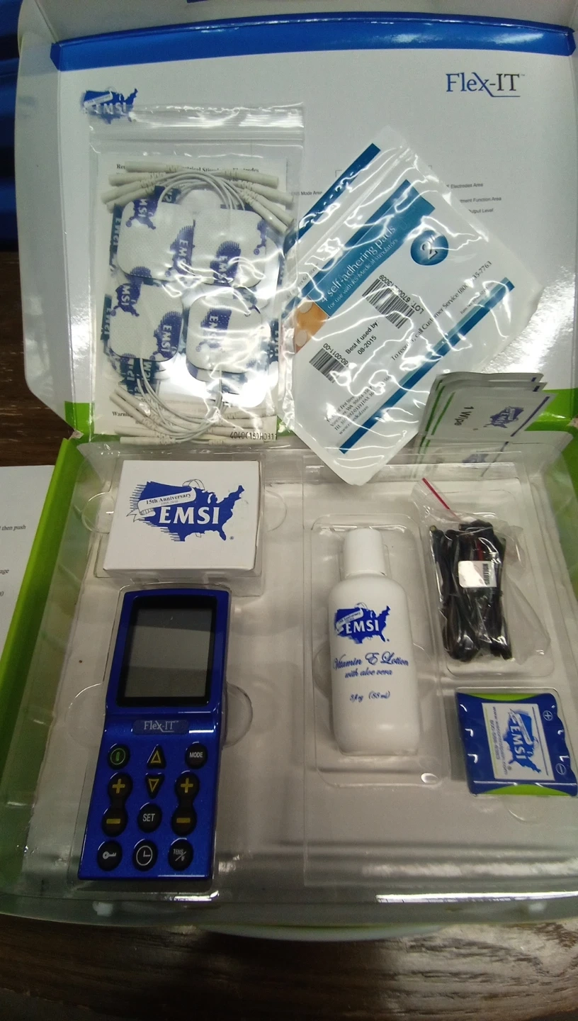 This EMSI Flex-IT Combination Unit comes with the device, instruction manual, and accessories. It includes a bottle of Vitamin E lotion and a travel case. This unit is designed for pain management. Includes TENS and IFC settings.
