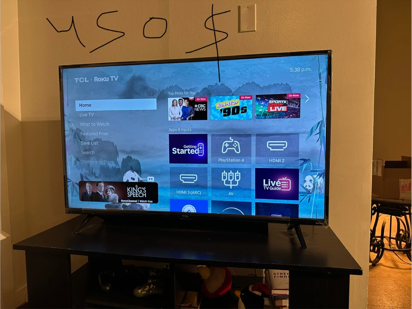 โข 43โ TCL 4K Roku Smart TV - Vibrant screen, apps loaded.