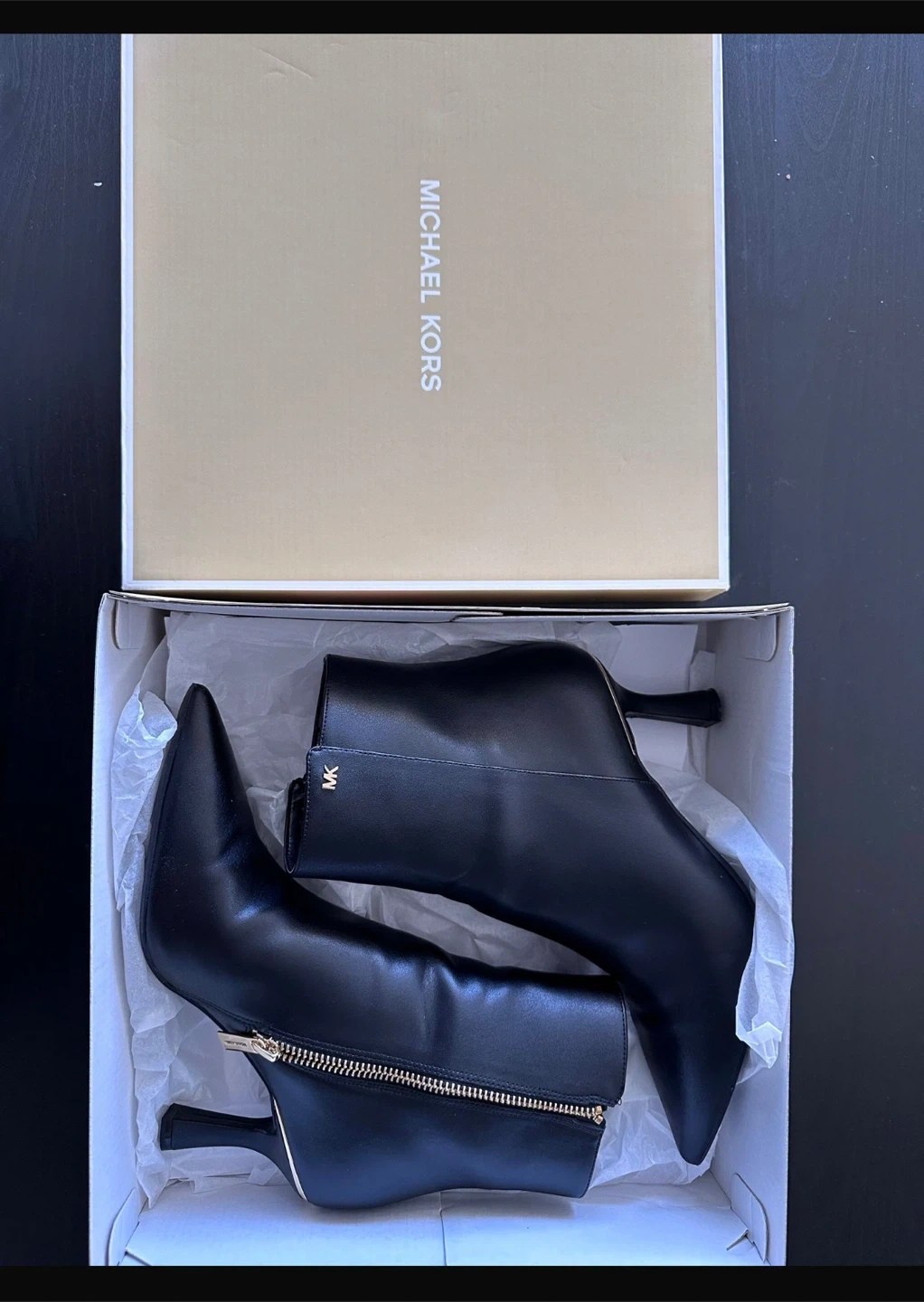 Selling a pair of Michael Kors black leather booties in size 6 US. They come in the original box and are in great condition! These stylish booties feature a sleek design with a side zipper and a comfortable heel height. Perfect for adding a touch of elegance to any outfit