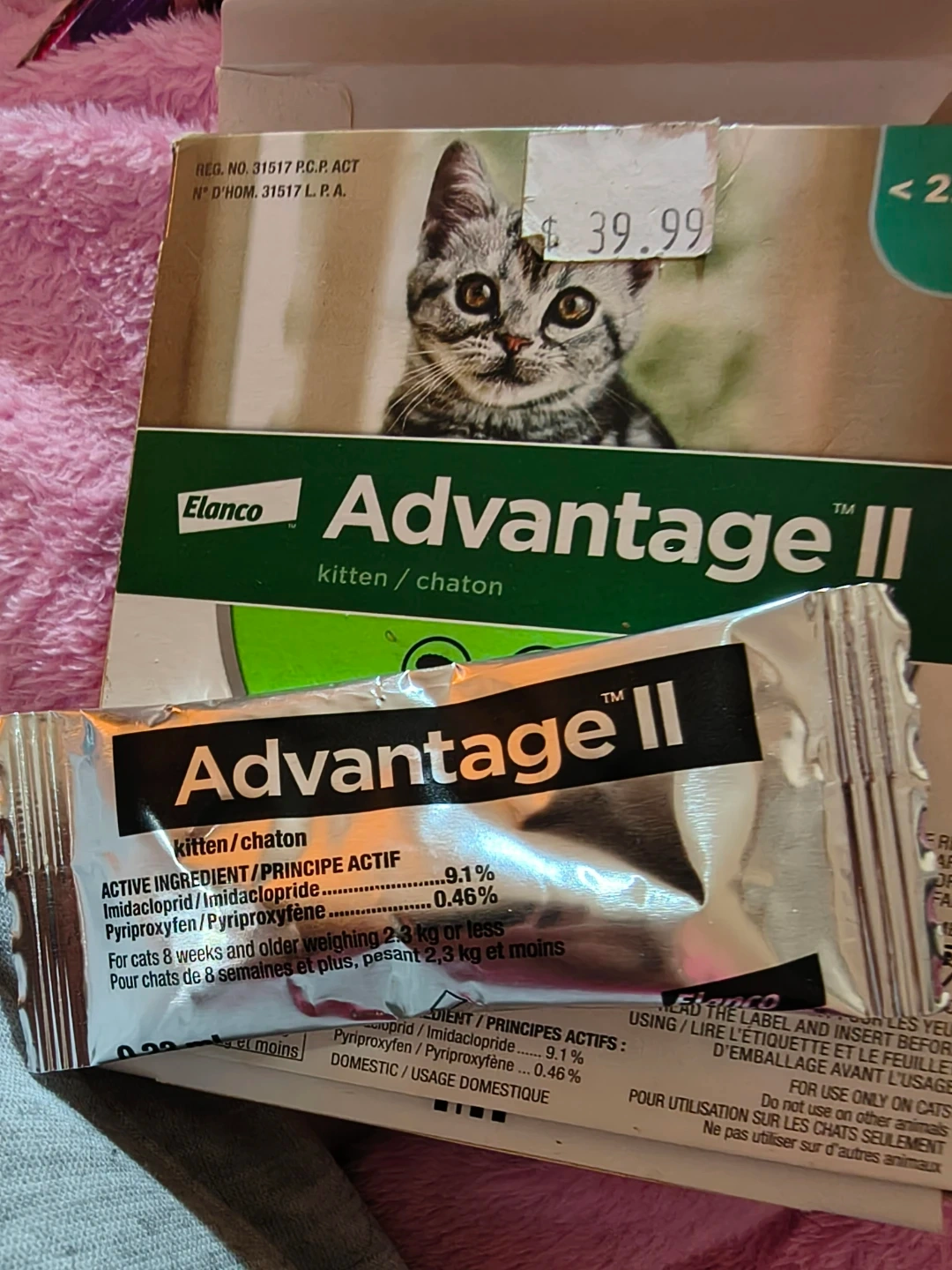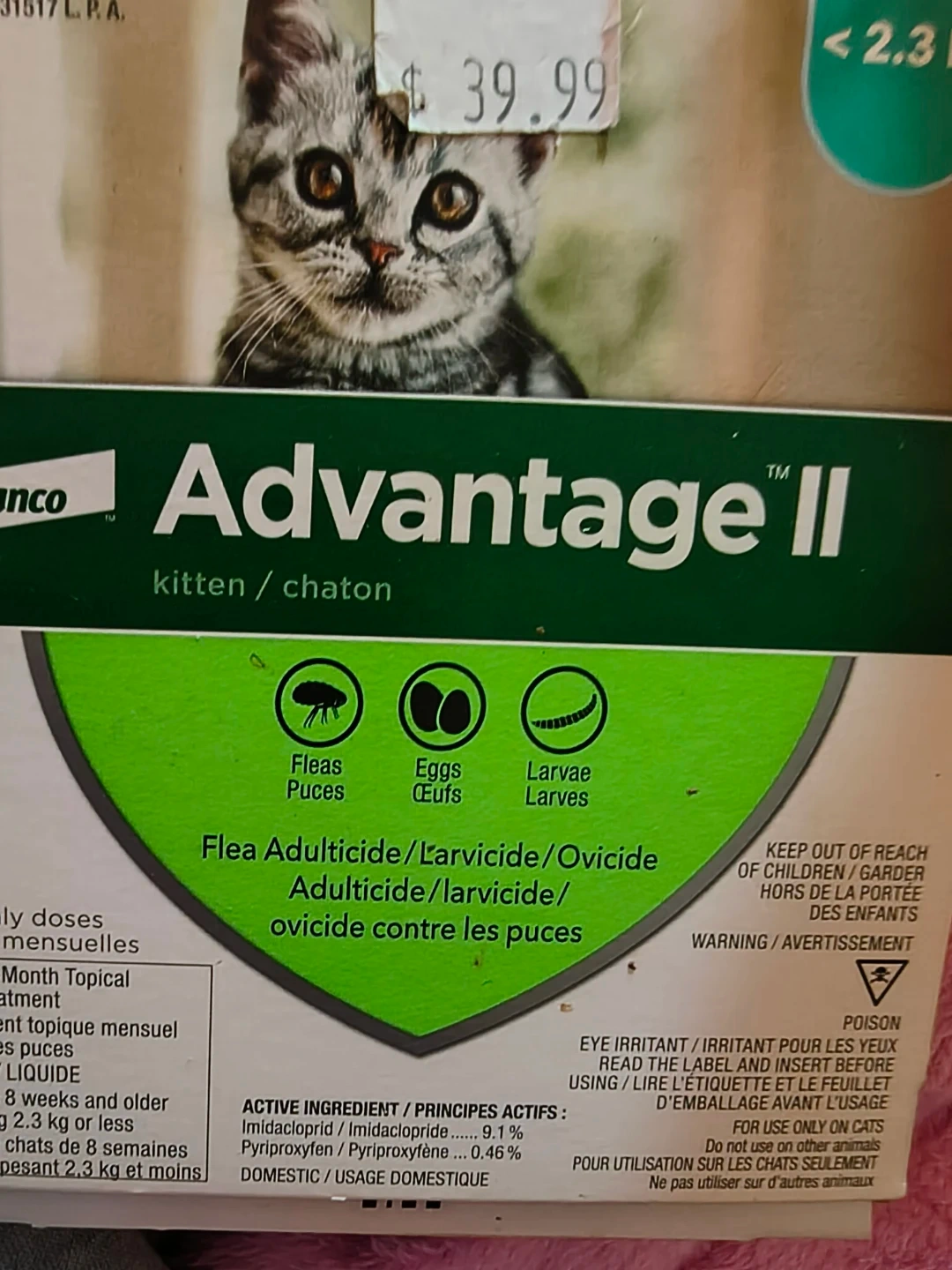 This is one dose of Elanco Advantage II flea treatment for kittens. It's for cats 8 weeks and older weighing 2.3 kg or less. Active ingredients include Imidacloprid and Pyriproxyfen.