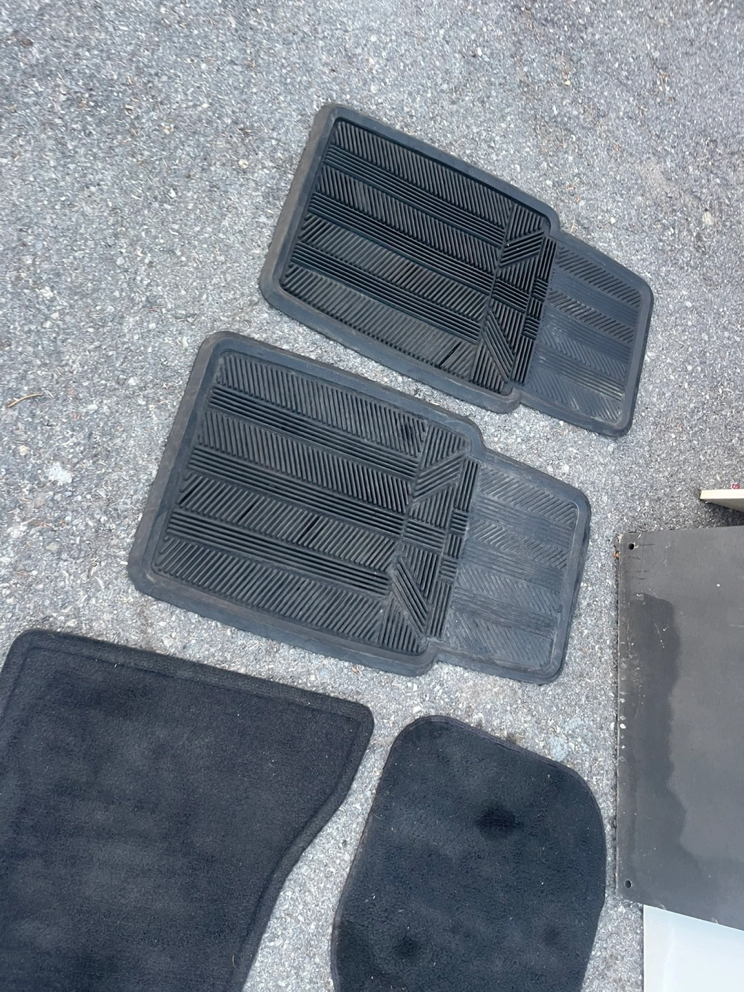 Used car floor mats. Set includes two rubber and two carpet mats. Some wear and tear. Great for replacing worn-out mats.