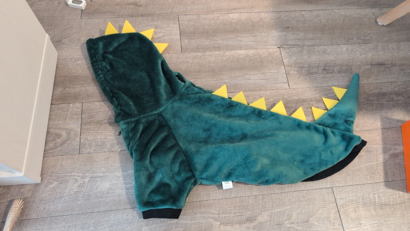 This fun pet costume is designed as a green dinosaur with yellow spikes along the back and tail. It's made of soft, plush material for comfort. The size is 5XL. It's perfect for Halloween or costume parties!