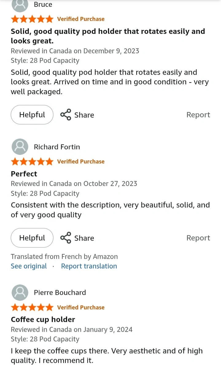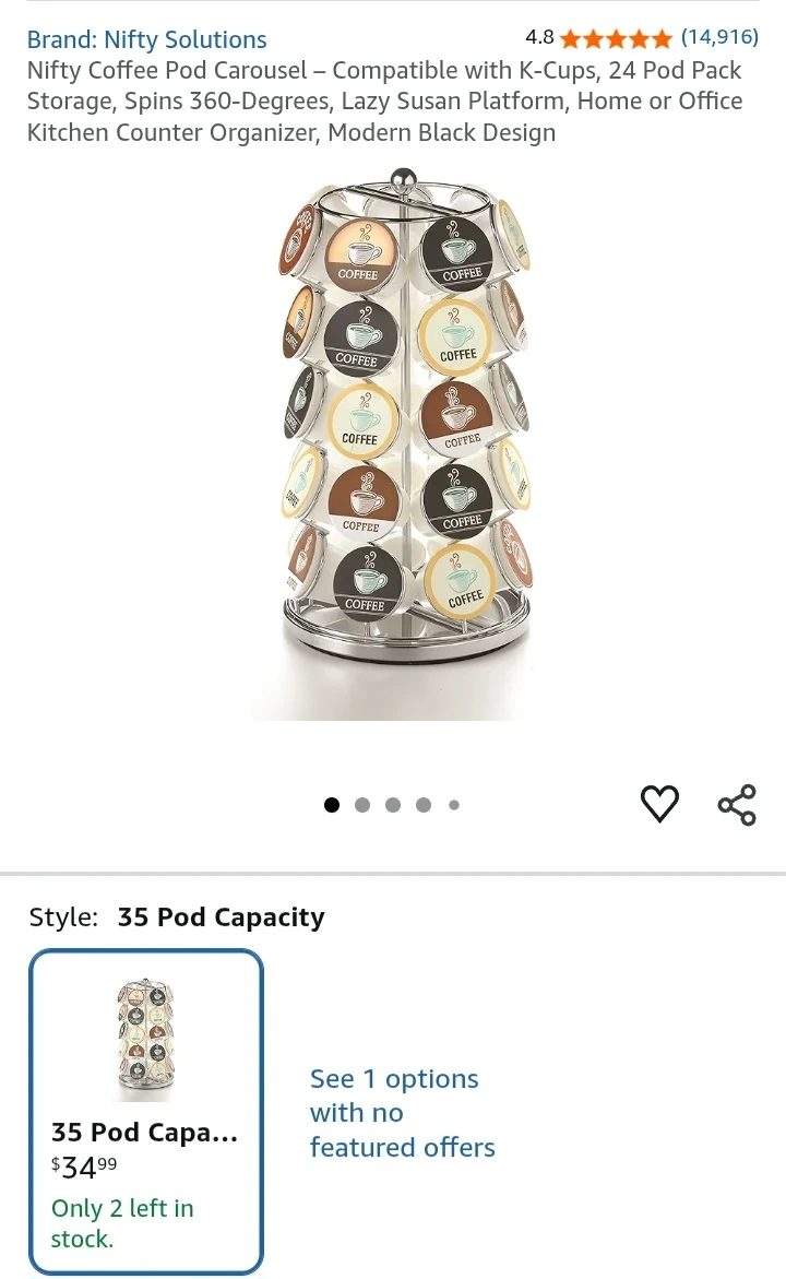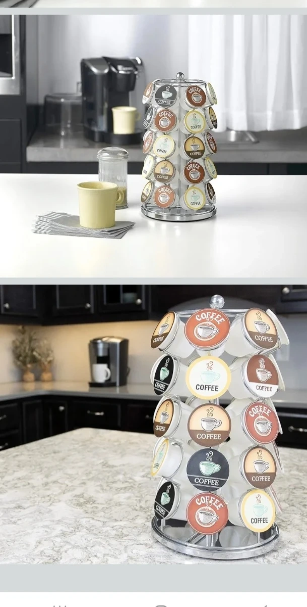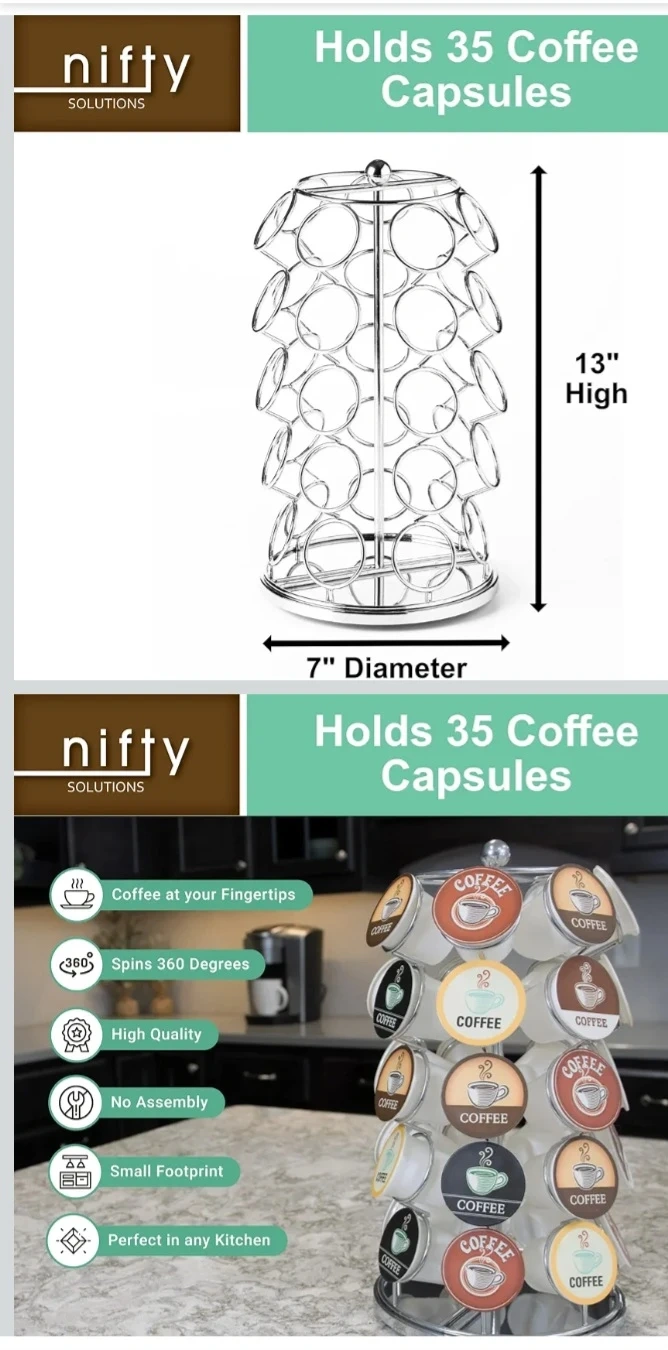 This coffee pod carousel holds 35 K-Cups. It's made of chrome-plated steel and spins 360 degrees. It measures 13 inches high and 7 inches in diameter. Keeps your kitchen neat and organized!