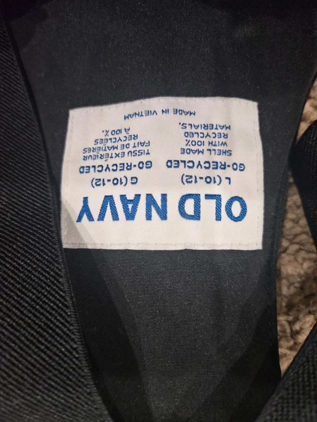 Old Navy ski bibs in black. Shell made with 100% recycled materials. Size L, fits 10-12 years. Made in Vietnam.