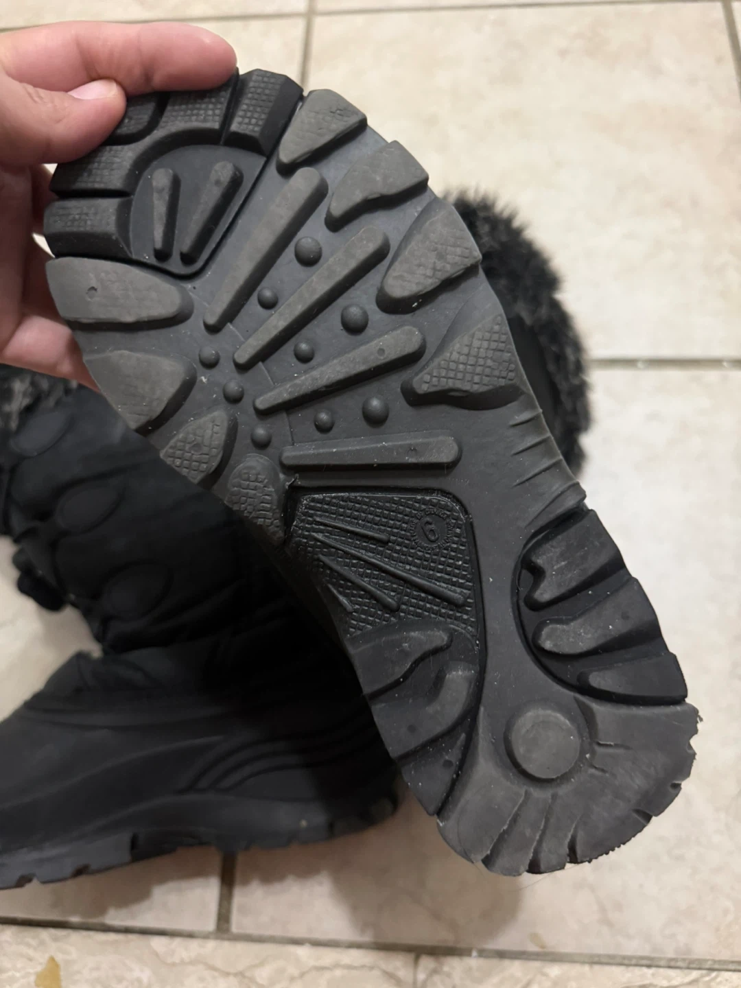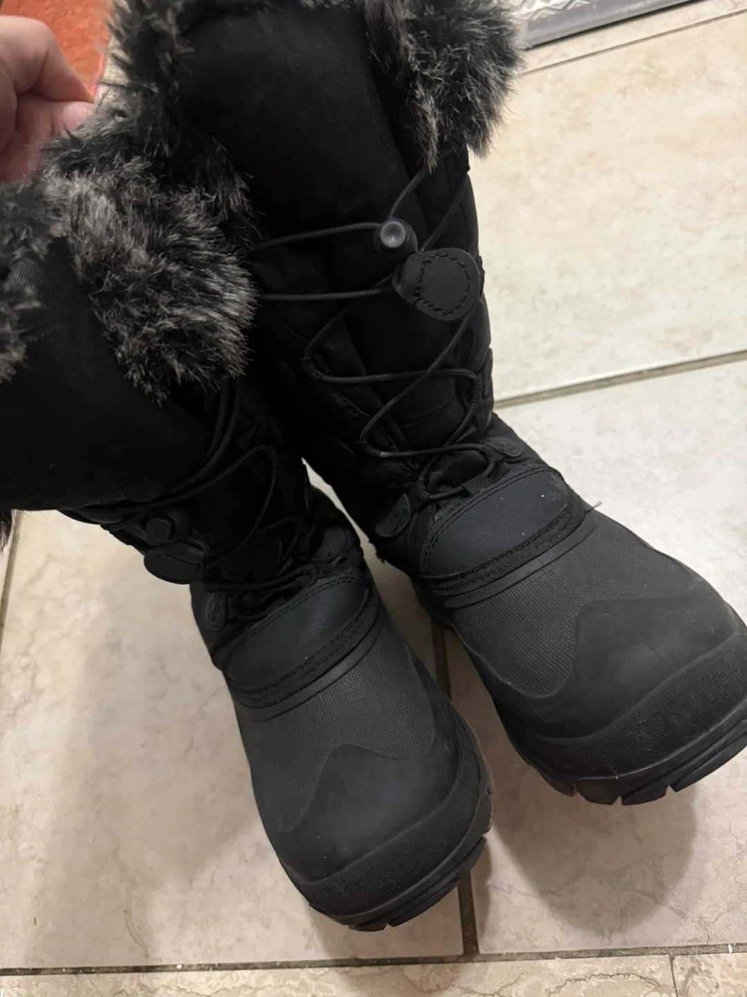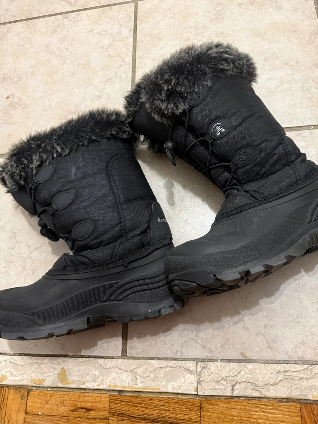 Kamik women's black snow boots with faux fur lining for warmth. Water-resistant upper and durable rubber sole. Features a toggle and button closure for a secure fit. Size 6. Good condition. Used twice. No box.