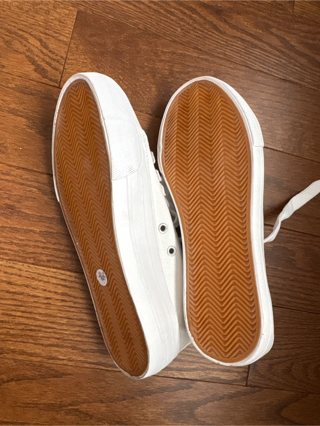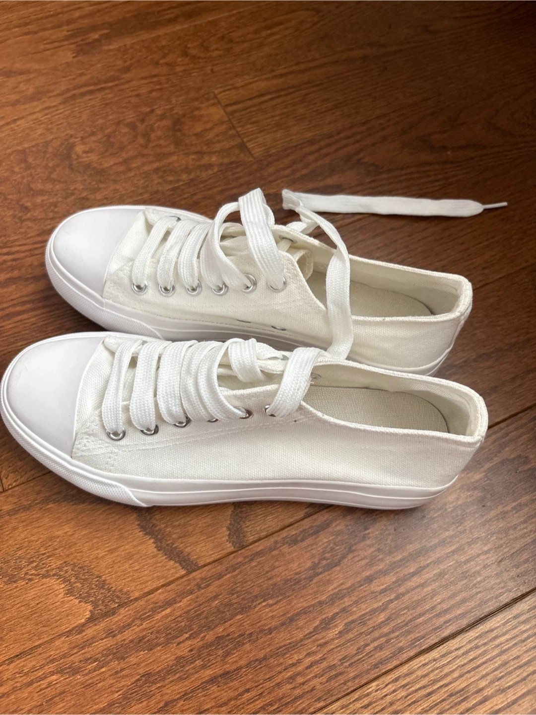 New White canvas low-top sneakers with a rubber sole. Includes an extra pair of white laces. Size is 37.5 EU/235 MM.