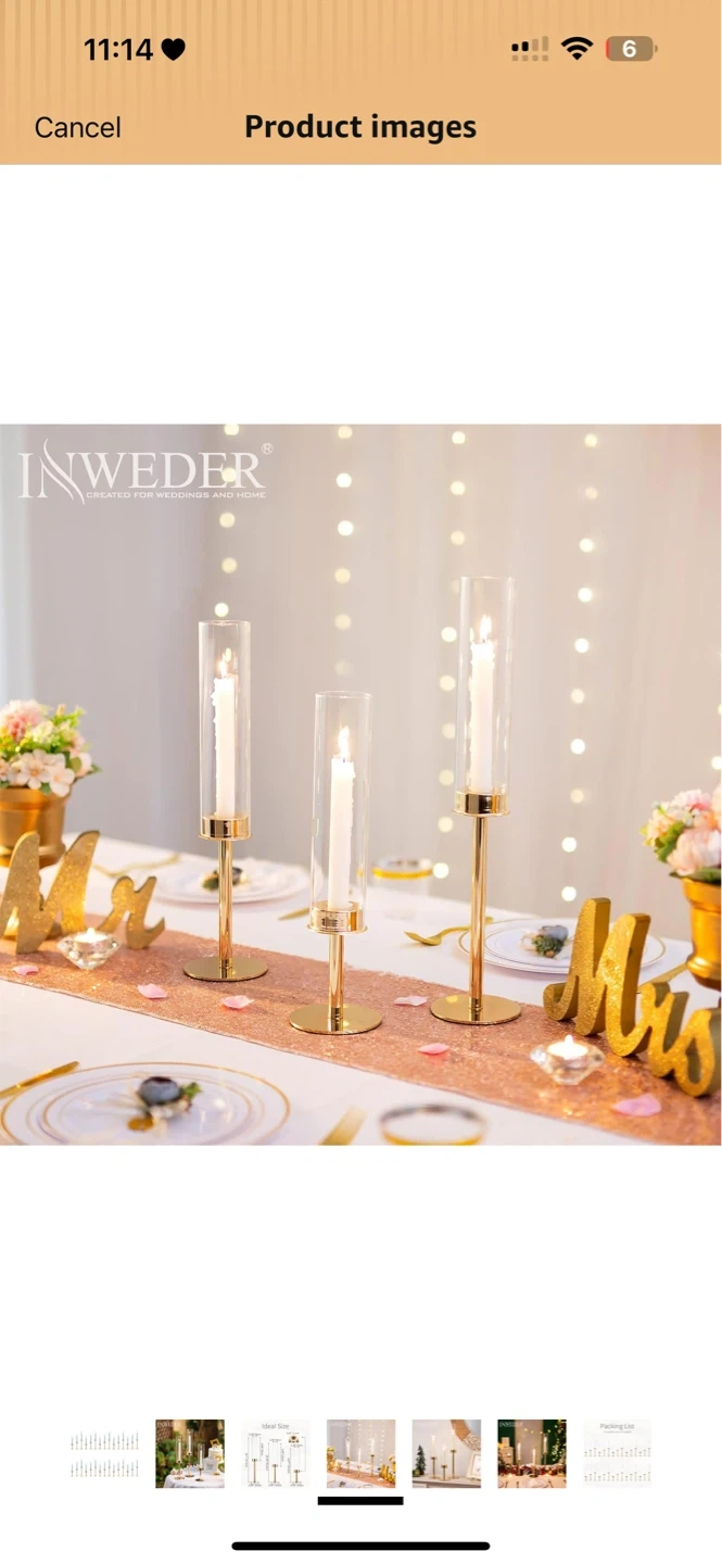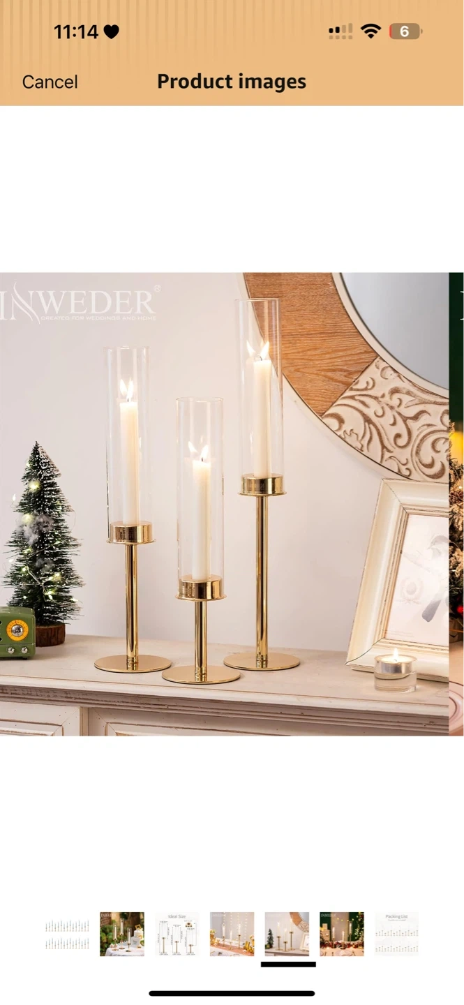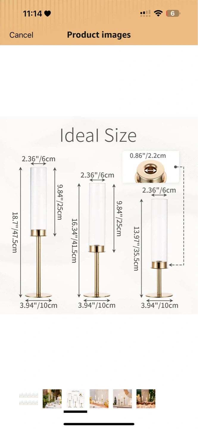 T This set includes three elegant gold metal candle holders with clear glass hurricanes. They're designed for table centerpieces, weddings, and home decor. The tallest holder measures 18.1 inches, the middle 16.34 inches, and the shortest 13.97 inches.