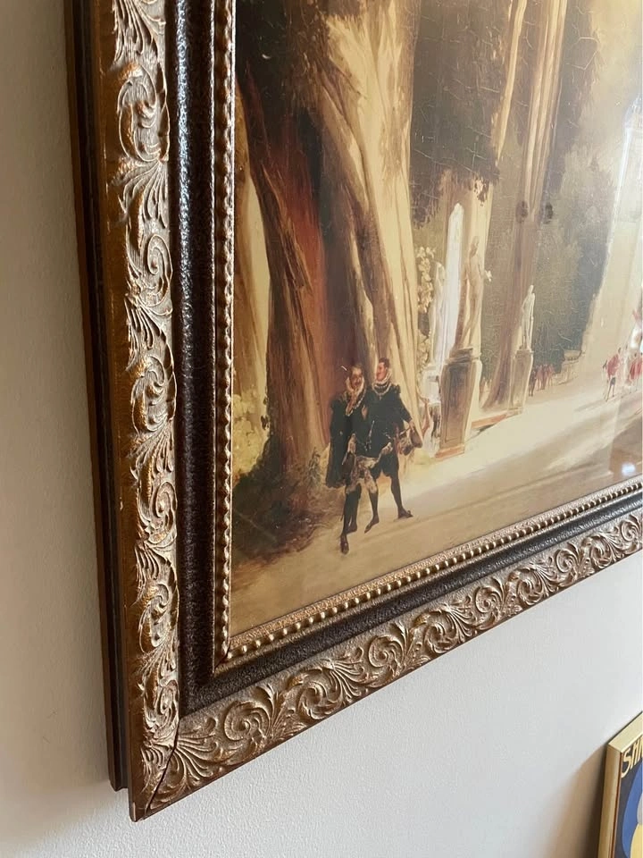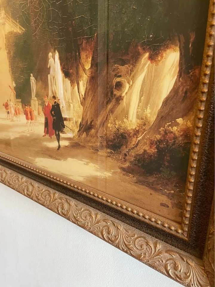 Very large framed print of the painting "In the Park of the Villa d'Este" by German Romantic painter Carl Blechen. Dimensions are 40"W x 48"H. Pickup only at Dundas and Roncesvalles.