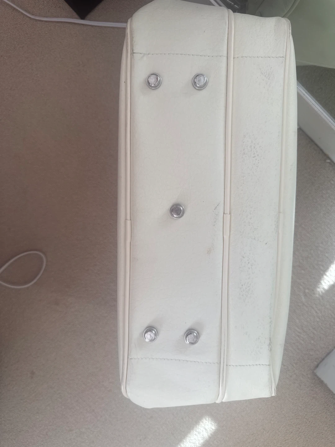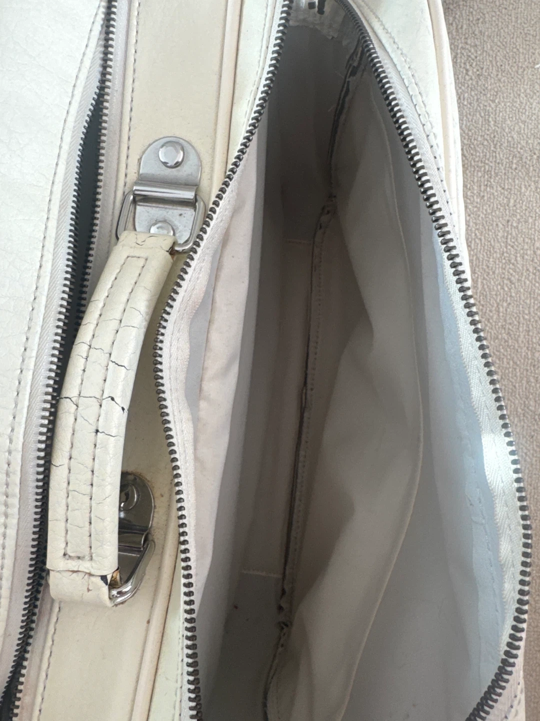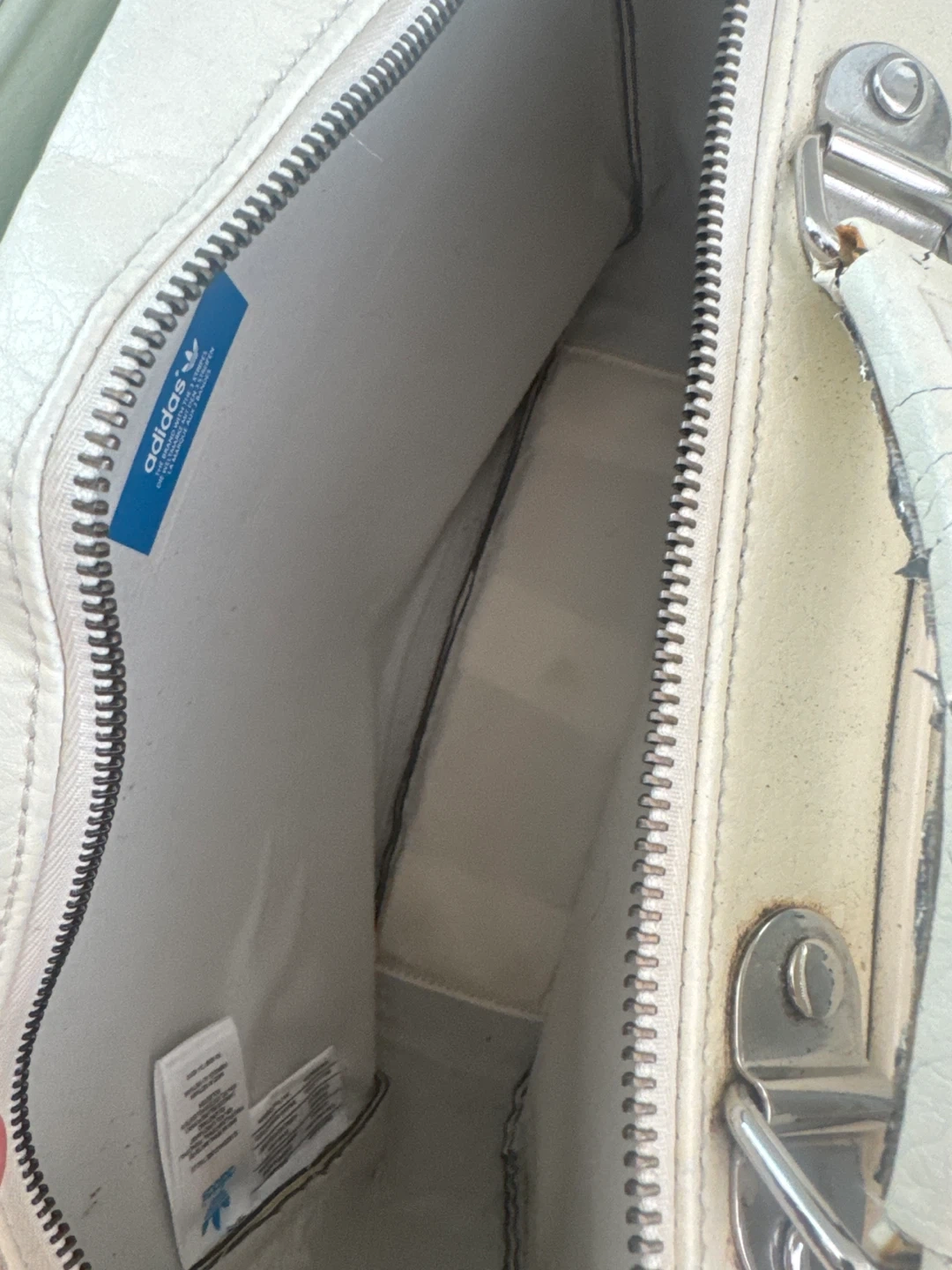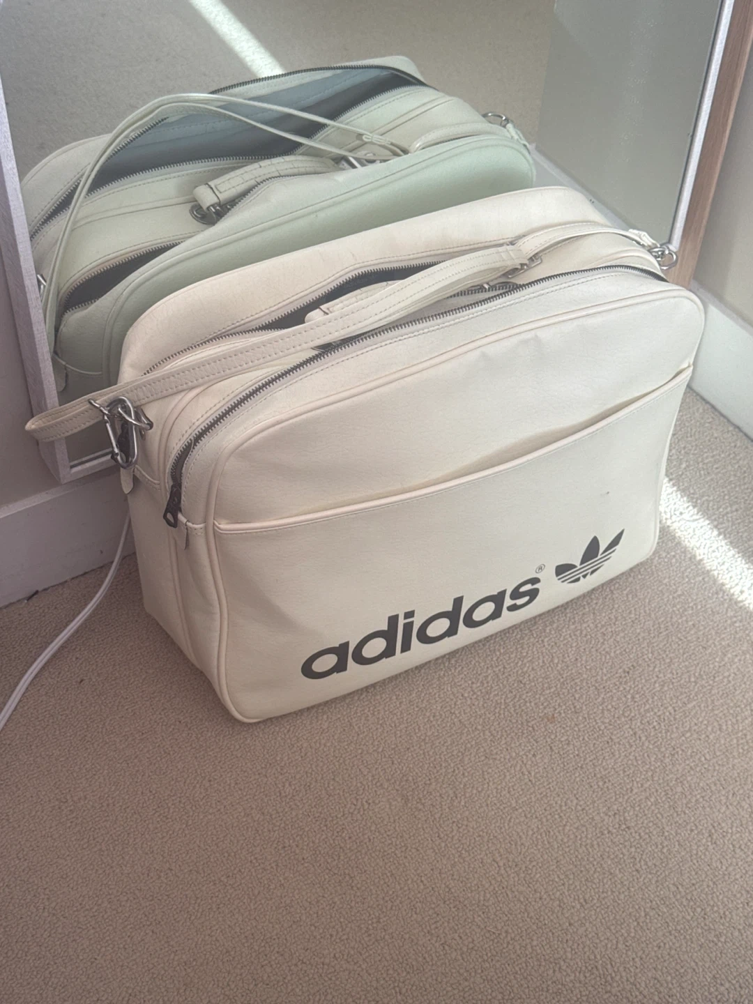 Vintage - Cream-coloured Adidas satchel bag with iconic trefoil logo. It features a zippered main compartment and an external pocket. Durable synthetic material is slightly cracked on handle and one side. Has a shoulder strap available. Best offer - not sure what it’s worth.