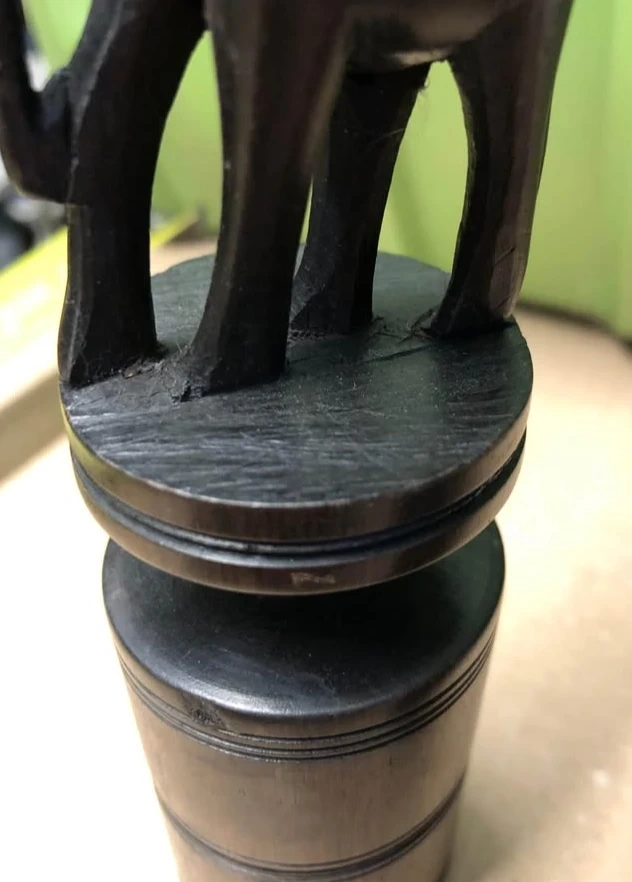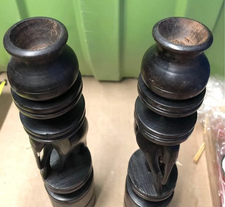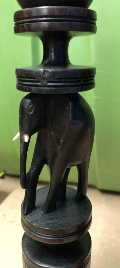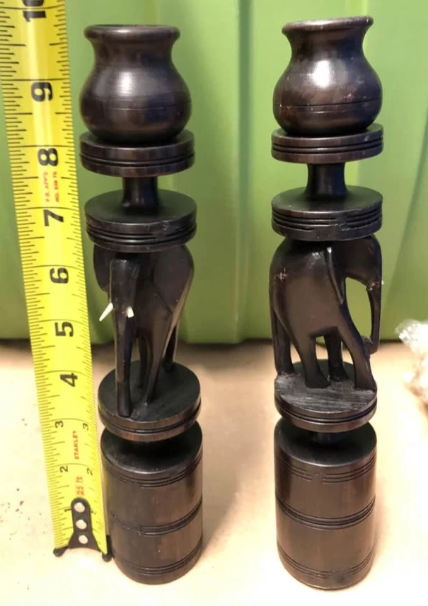 These are a pair of wooden candle holders from Tanzania. They feature carved elephants with pots on top. The candle holders stand about 8 inches tall. Adds a unique decorative touch to any room!