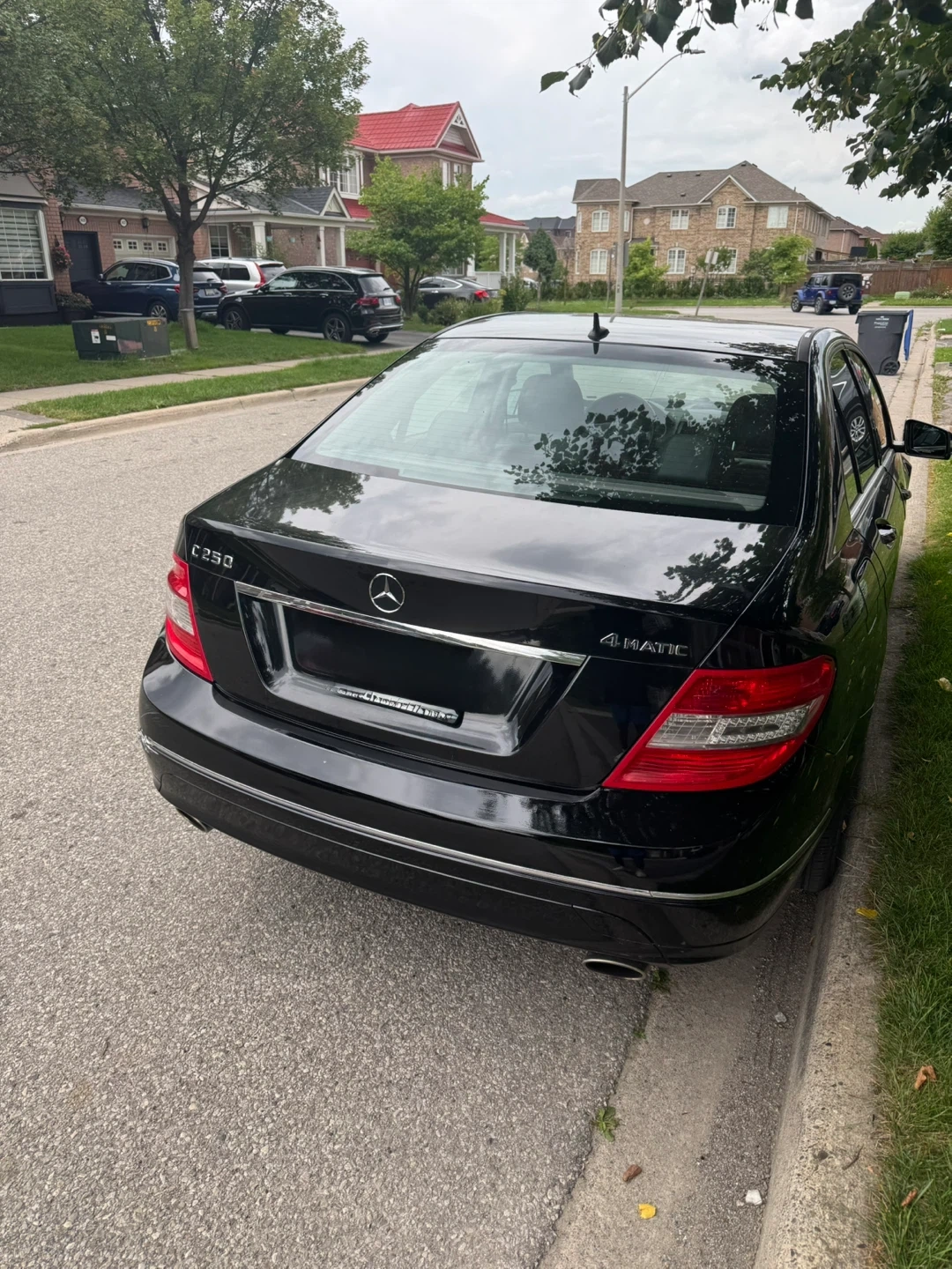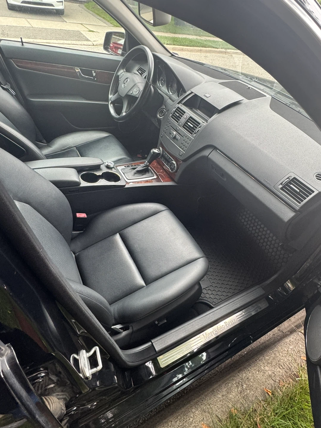 This is a black Mercedes-Benz C-Class sedan. It features black leather interior with wood trim accents. The odometer reads 208,073 km. This car's suitable for daily commutes or longer road trips.needs a new battery.