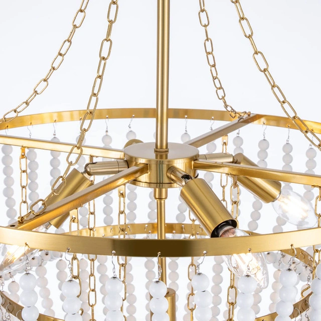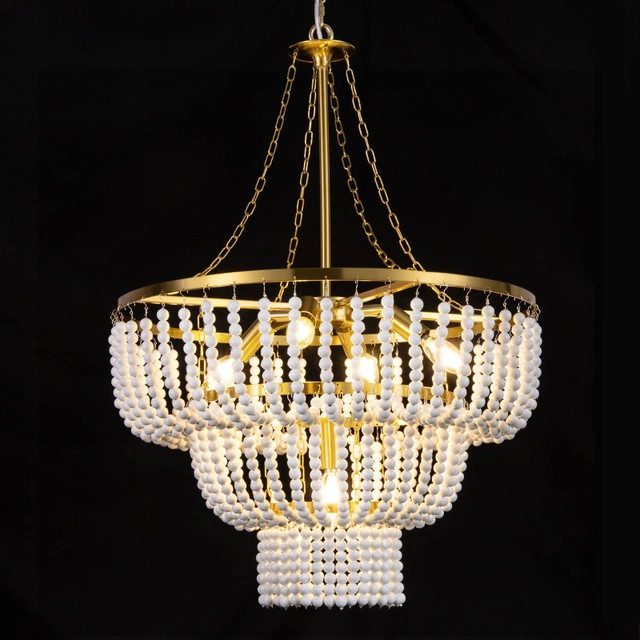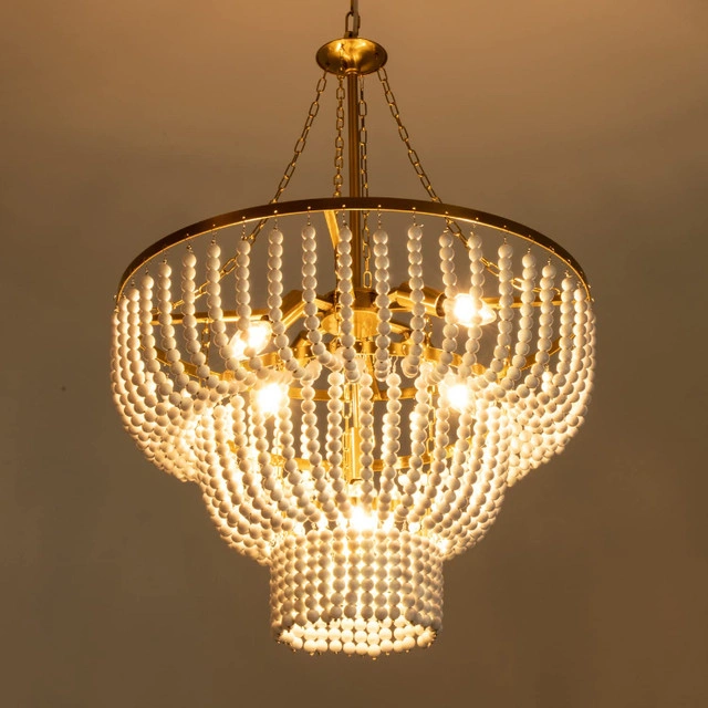 Wellmet 22” Boho Wood Beaded Chandelier for Dining Room, Farmhouse Gold Pendant Light 3 Tiers, Coastal White Chandelier for Bathroom,Foyer,Entryway, Brushed Brass Finished with Oak White Bead