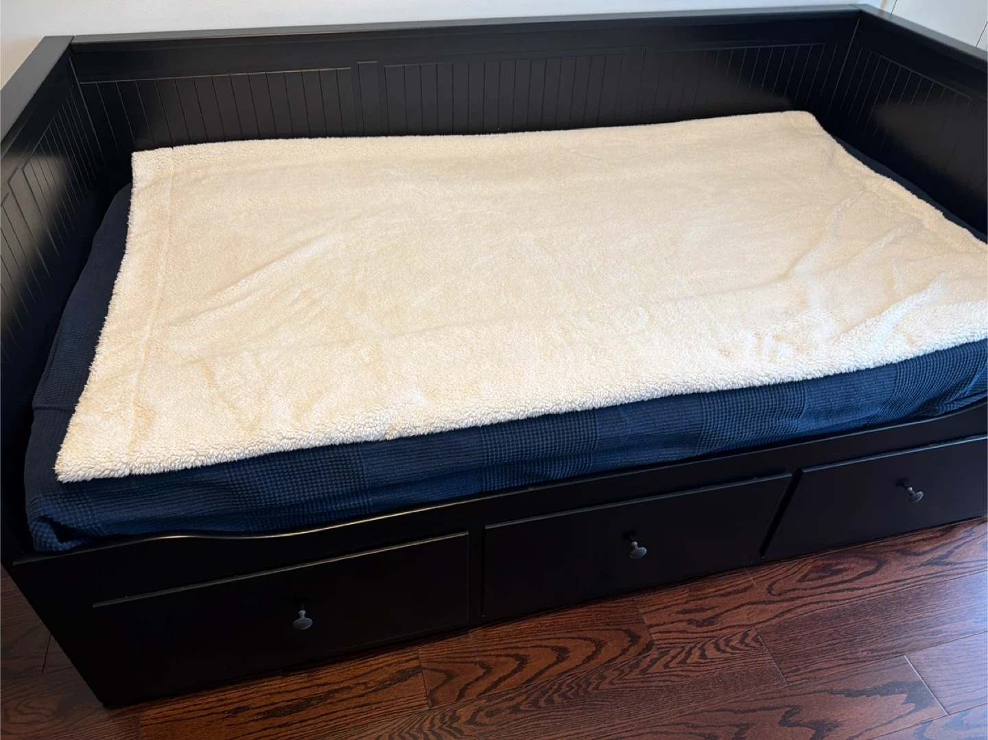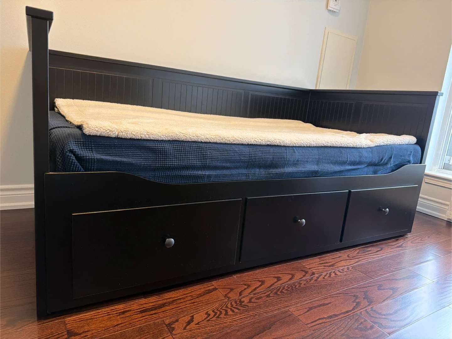 A black-brown daybed from IKEA with three storage drawers underneath. It's perfect for a bedroom or guest room. We are including two mattresses and it can be extended.