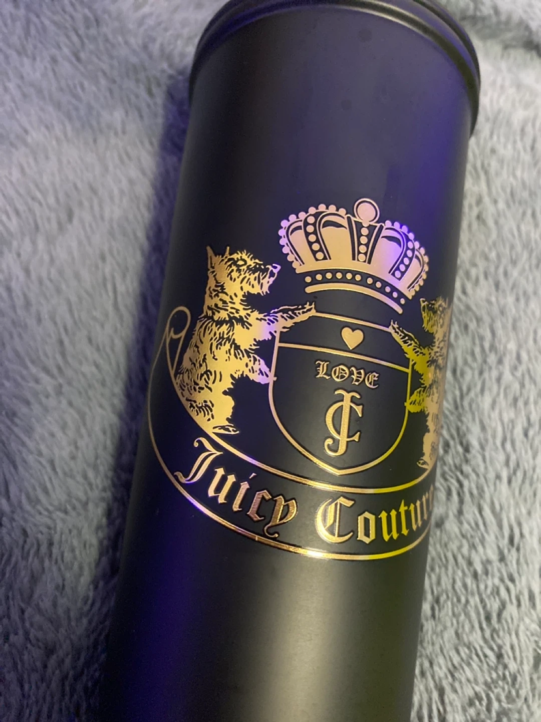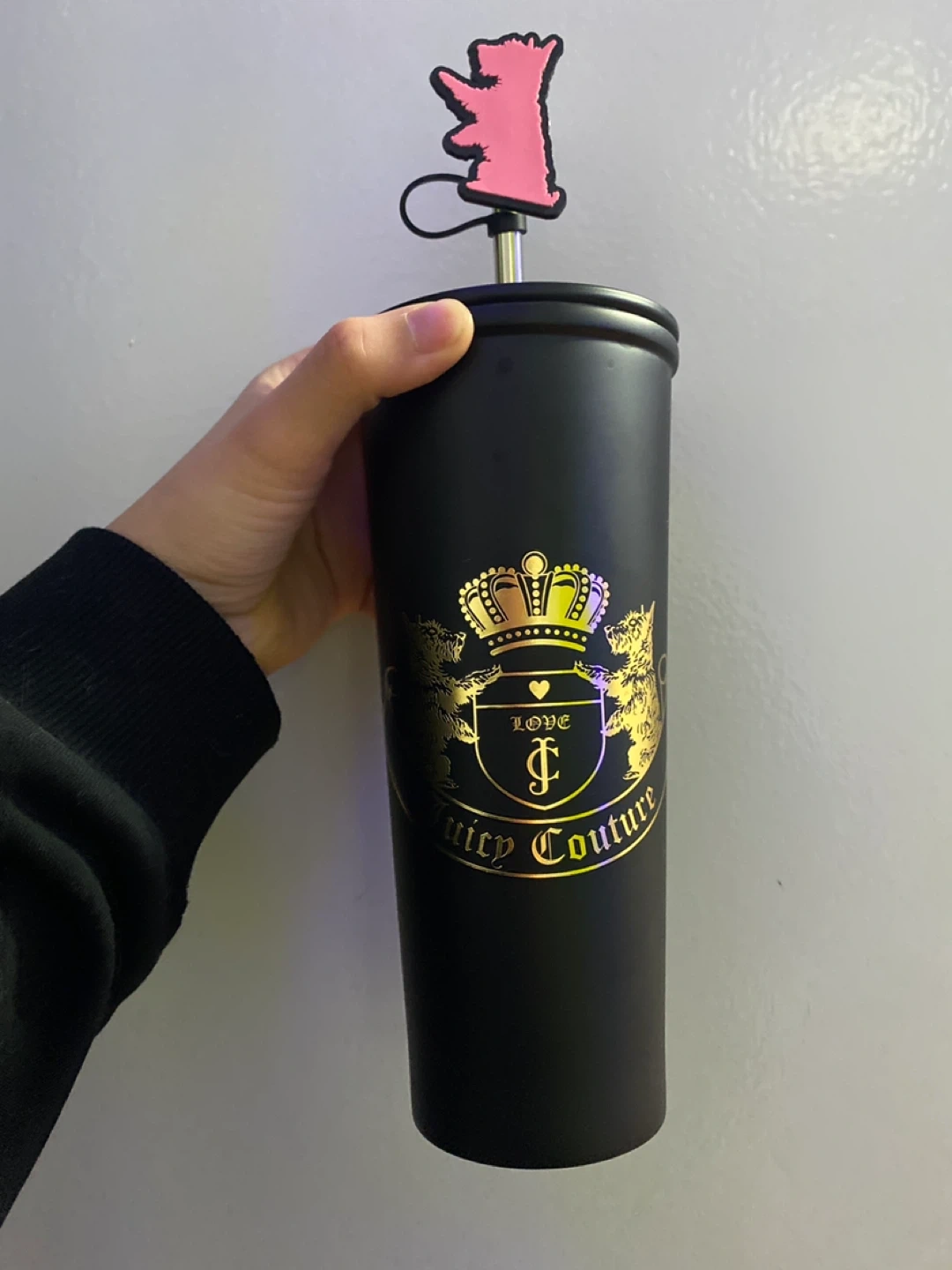 This Juicy Couture travel tumbler is black with gold crest detailing. It comes with a cute pink pig charm on the straw! It's a stylish way to carry your beverages on the go.