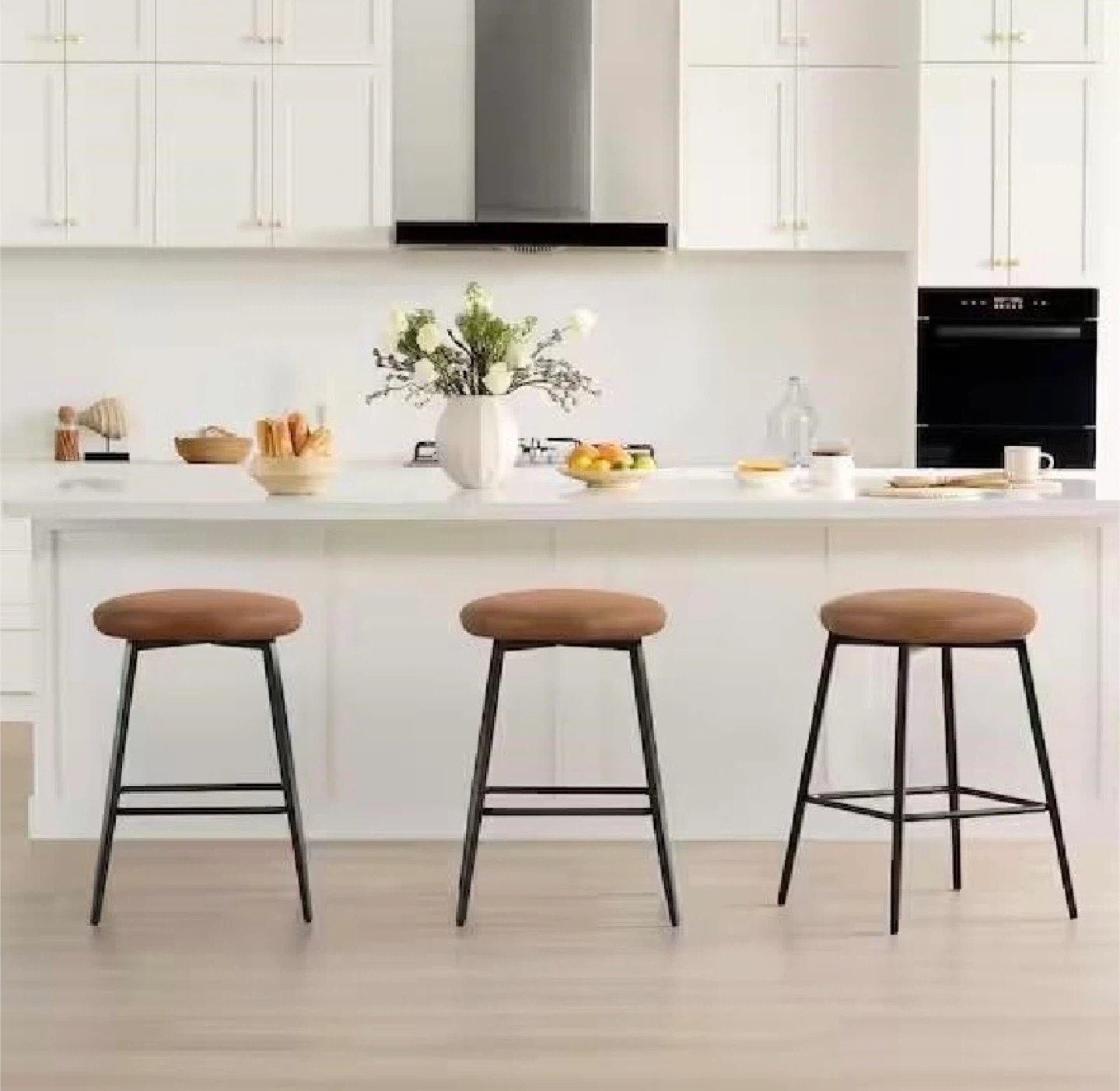 This set of three 24-inch counter bar stools, still sealed in their original packaging! These stools feature a sleek black metal frame and a comfortable, stylish tan upholstered seat. This set is ideal for adding a modern touch to your kitchen island or bar area.