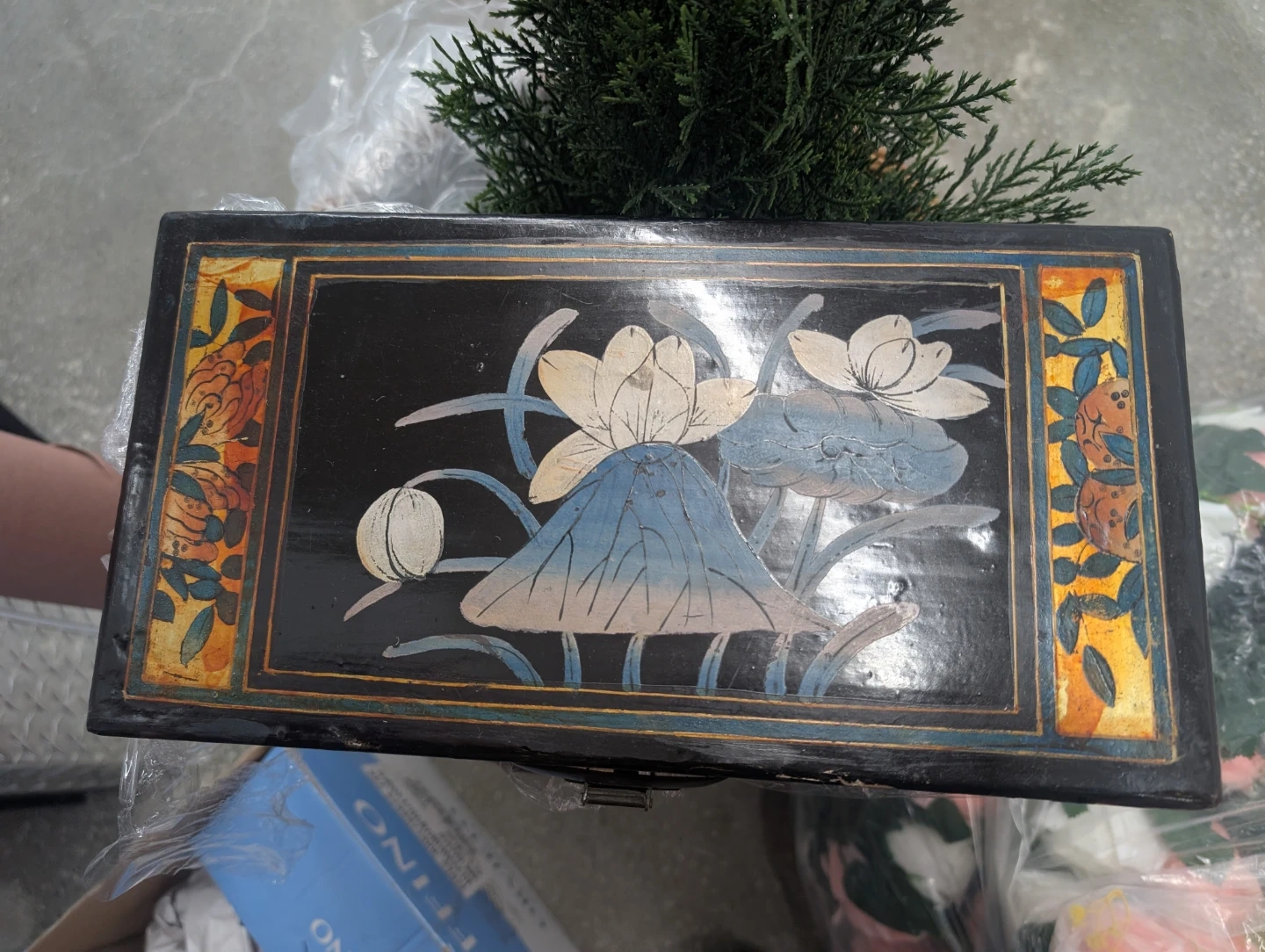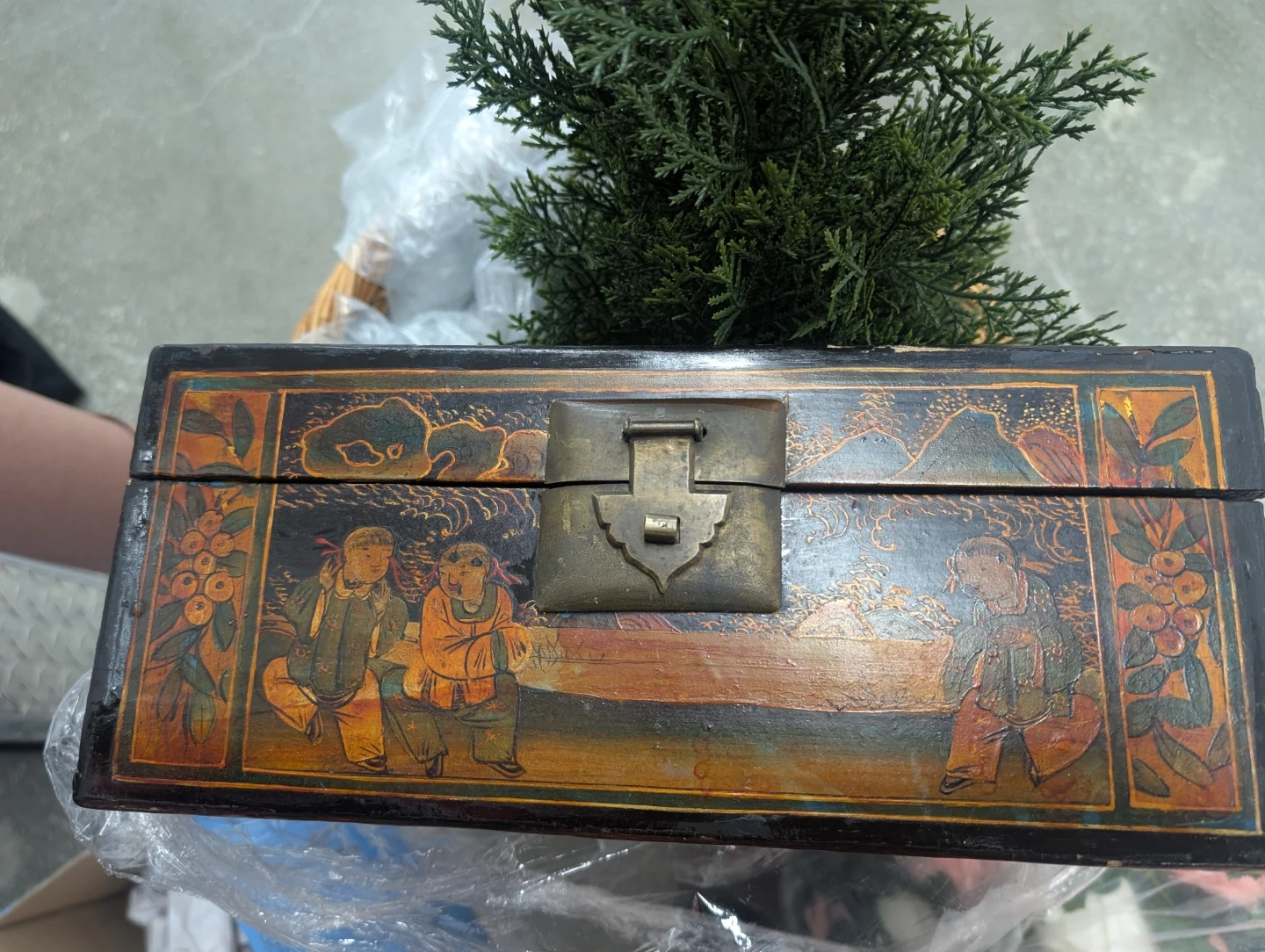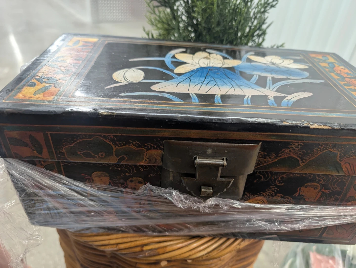 This is a vintage wooden trinket box with decorative painted scenes. It features a metal latch closure and a red-lined interior. The box is black with colourful artwork of people and nature scenes.
