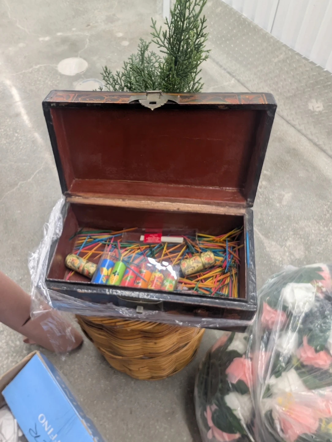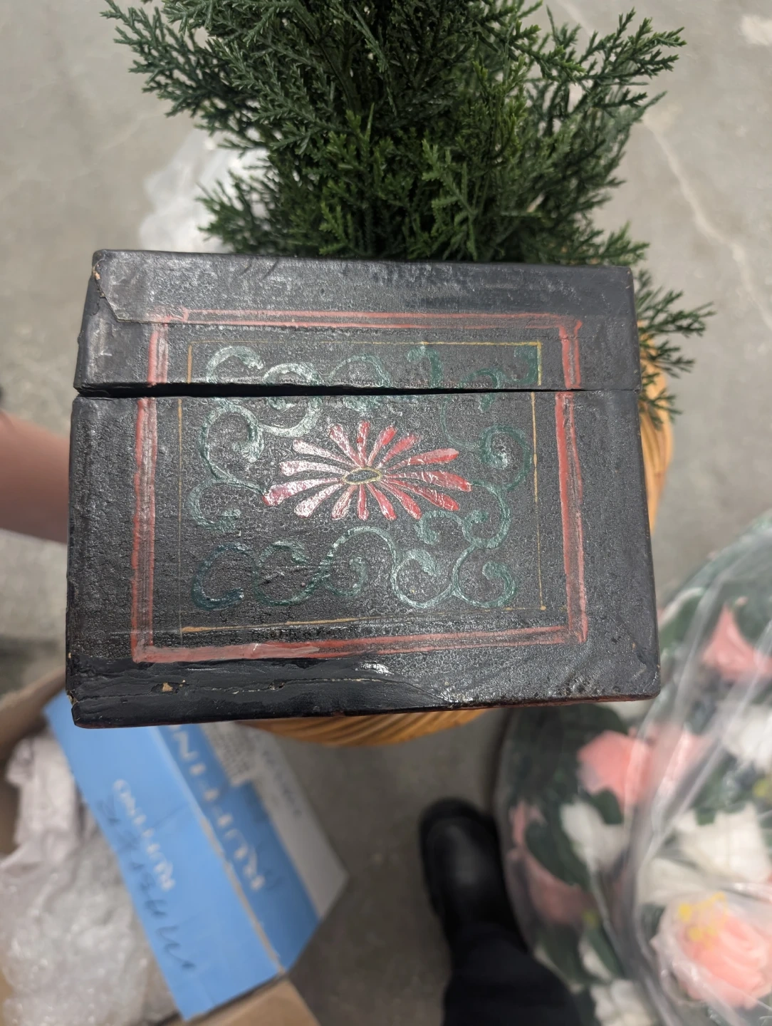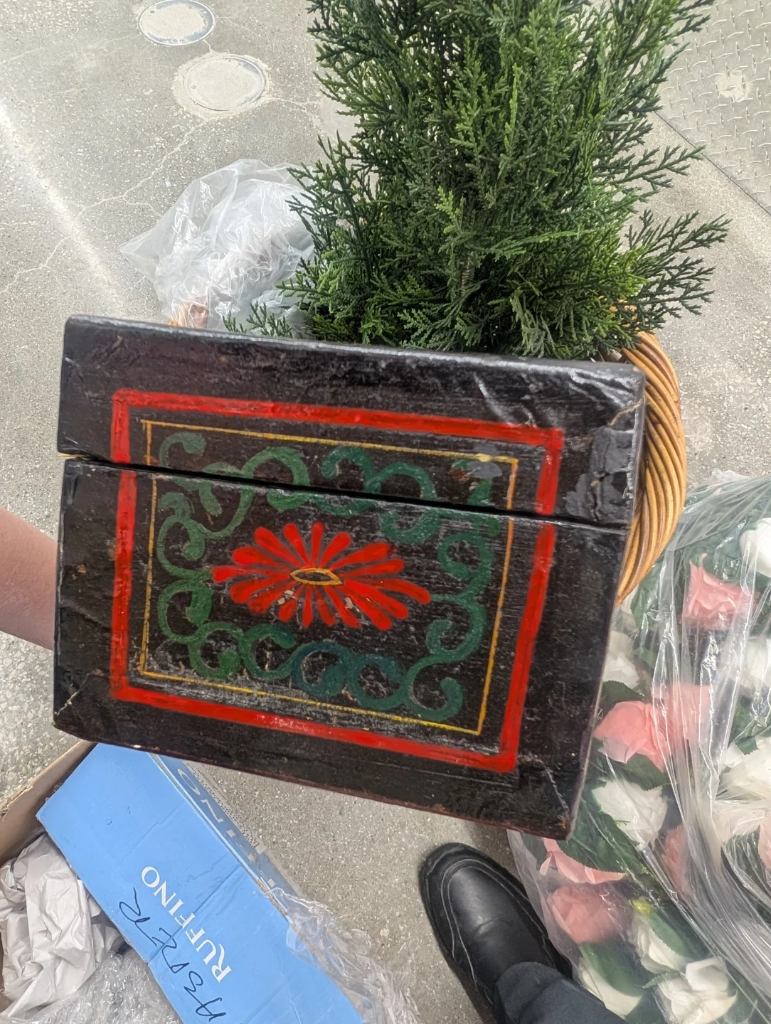 This is a vintage wooden trinket box with decorative painted scenes. It features a metal latch closure and a red-lined interior. The box is black with colourful artwork of people and nature scenes.