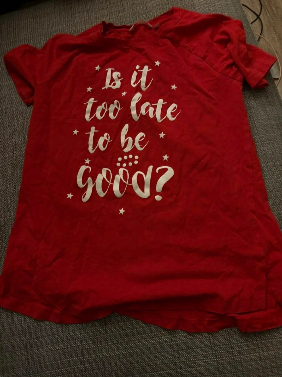 Bundle includes a grey sleeveless tank top with 'Cosmic Journey' graphic, a grey t-shirt, a red t-shirt with 'Is it too late to be good?' text, and pink dolphin shorts with white trim. Perfect for casual wear!