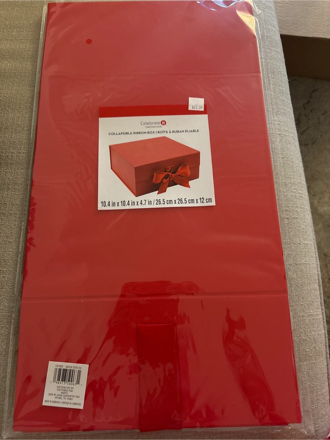 Celebrate It collapsible ribbon box in red. Box dimensions are 10.4 x 10.4 x 4.7 inches. I have 6 available