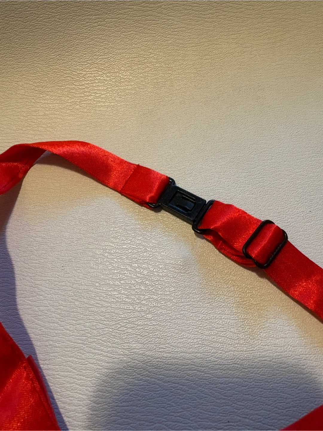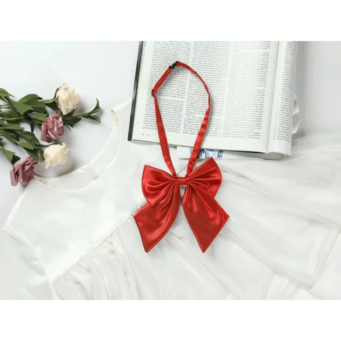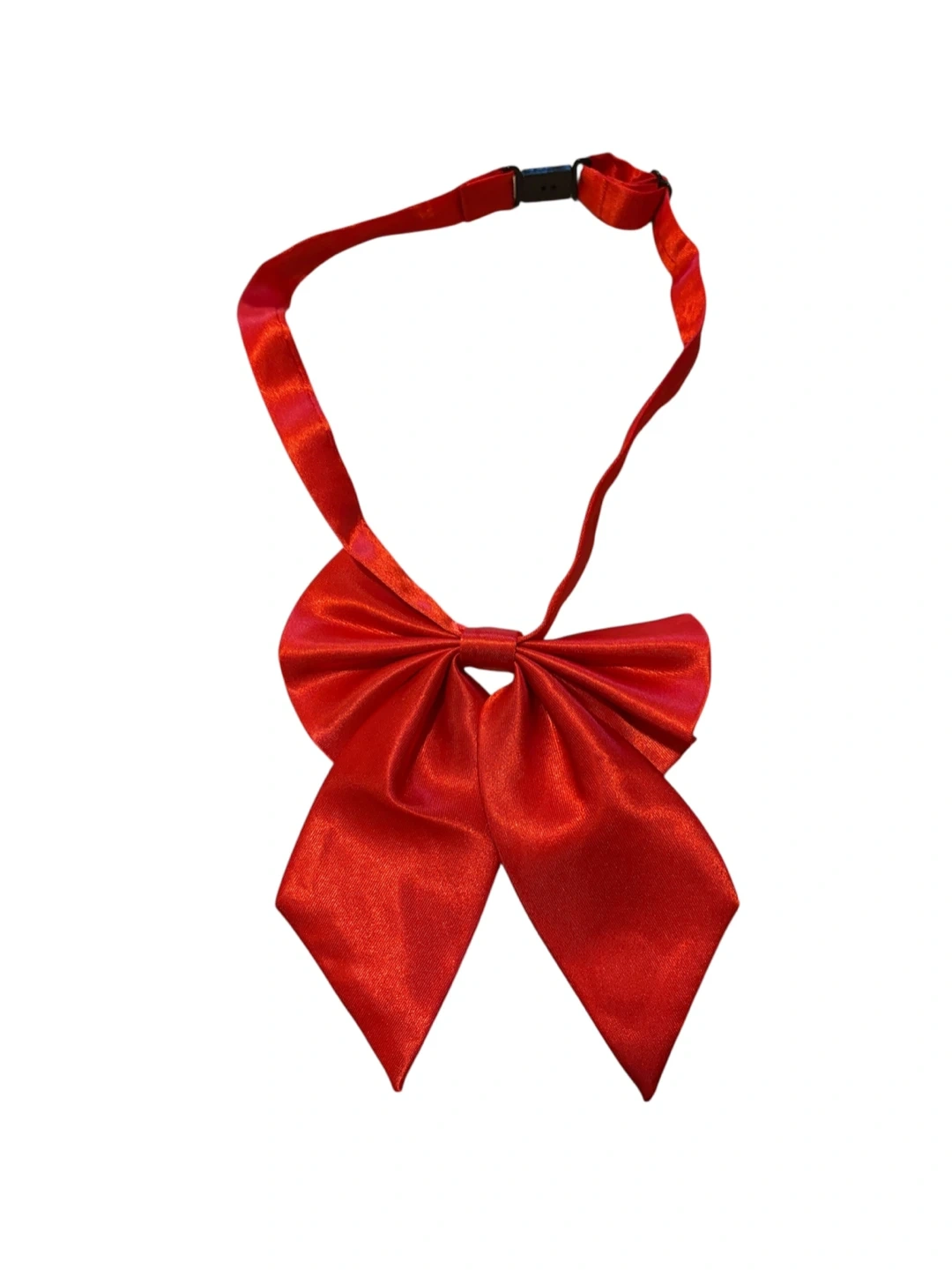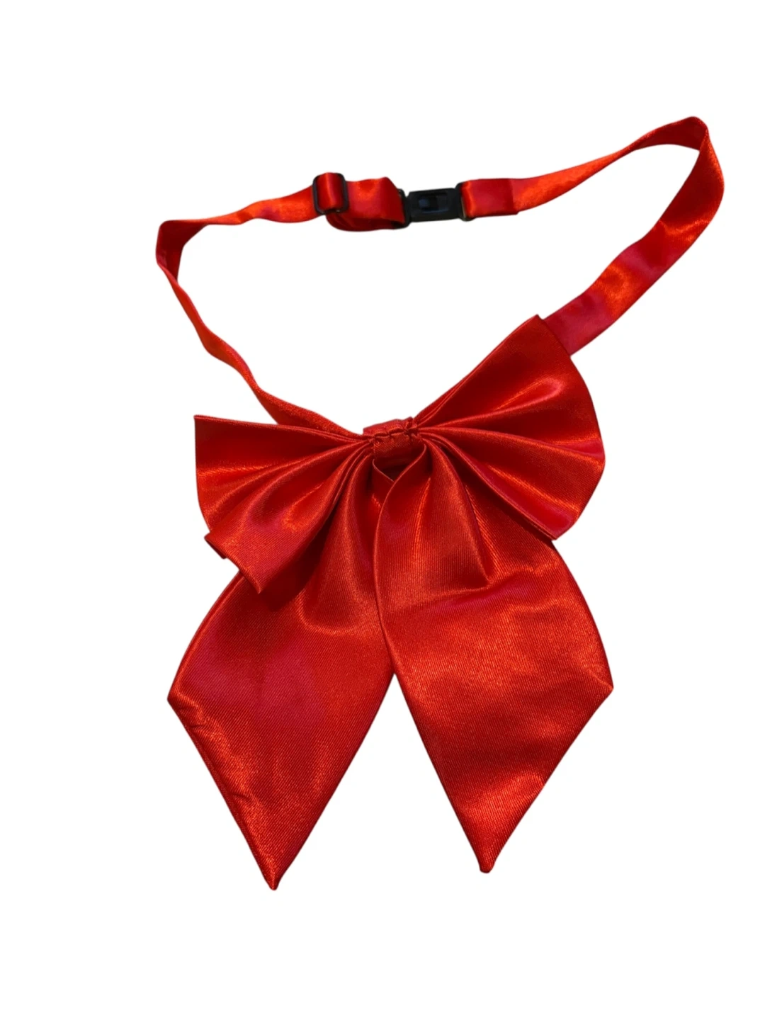 Cute oversized red bow tie accessory with a classic satin finish and adjustable neck strap. This pre-tied bow adds a playful statement to blouses, dresses, polos, or costume looks. The bold shape and vibrant color make it perfect for styling outfits with a fun, coquette-inspired touch.