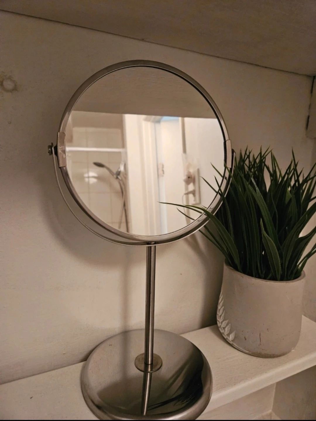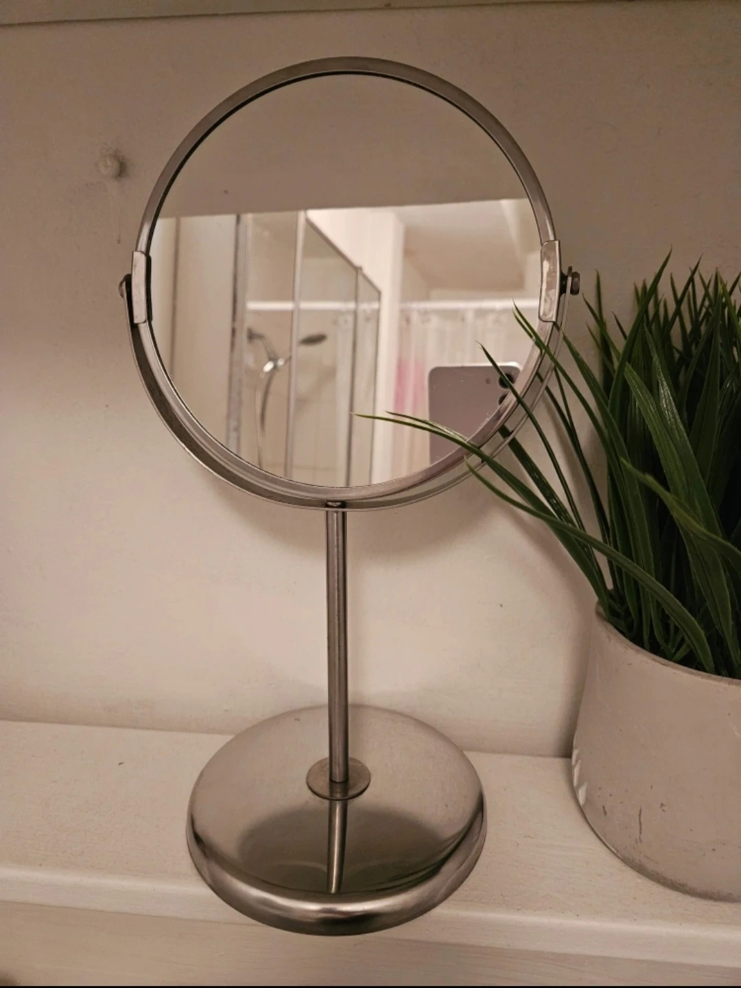 Selling a silver vanity mirror. It's in great shape and would be perfect for a bathroom or bedroom. It's a simple and stylish design that would fit in with any decor.