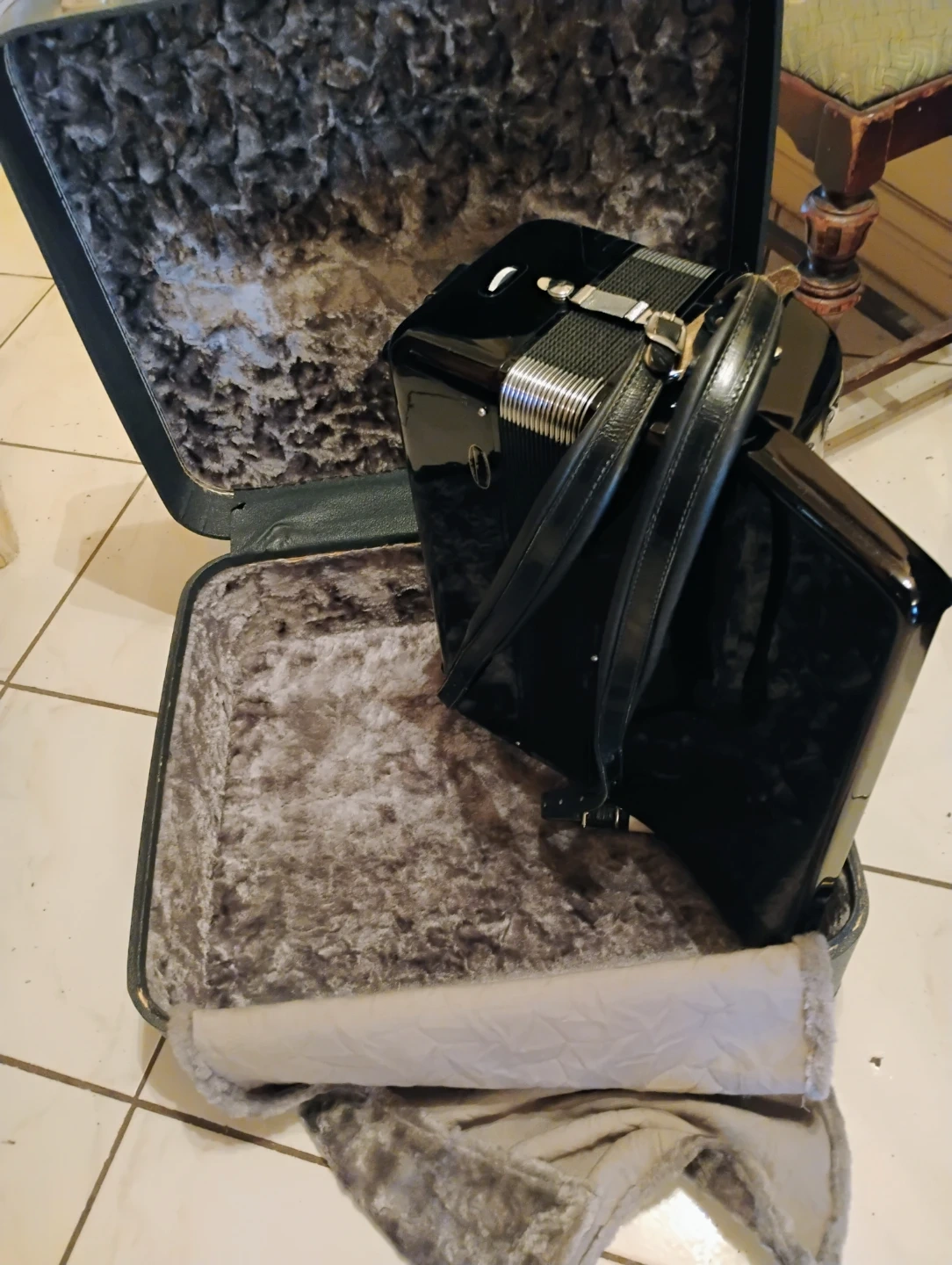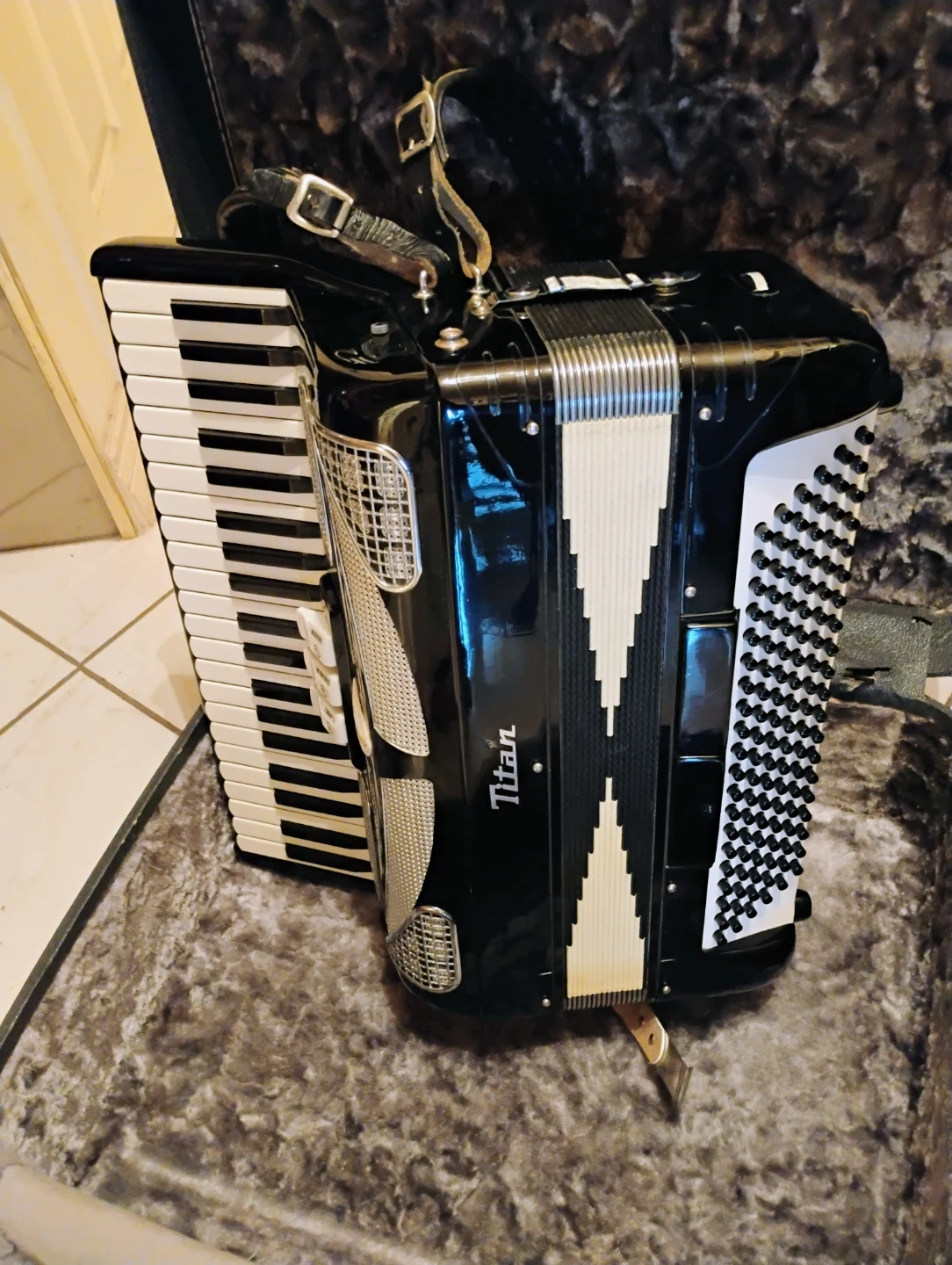 For sale vintage Italian Accordion Titano ! Black in great condition 120 bass ! 3 registers $599.00! Complete case straps and all! Please contact me thank you π