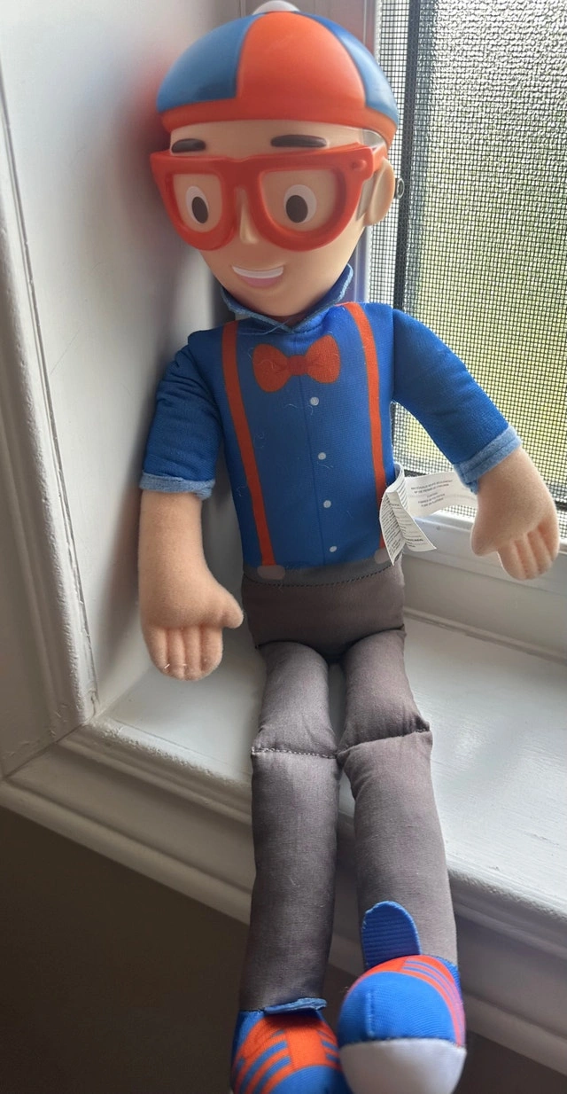 Almost new, rarely used My Buddy Blippi plush, great for on-the-go adventures. This 16” plush figure is the perfect size for your child! It's super durable and will last for countless playtimes to come. Squeeze Blippi’s belly to activate 15 recognizable Blippi sounds and phrases! From a smoke and pet-free home.