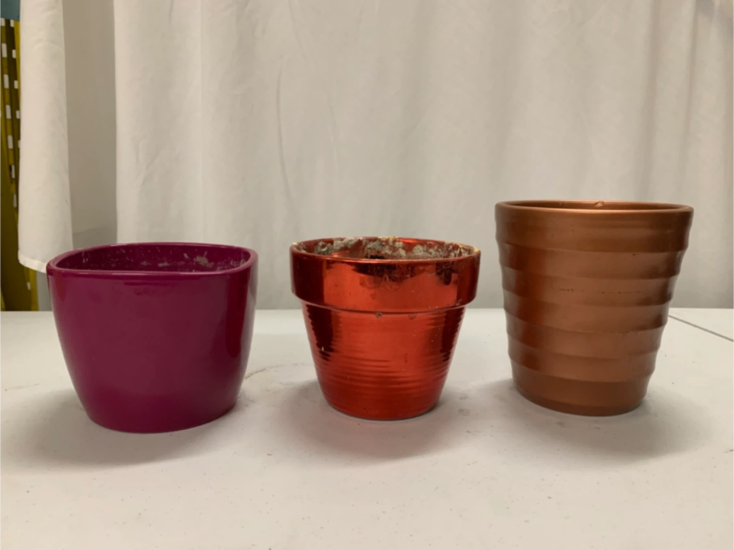 Includes: One vibrant fuchsia pot, one metallic red pot with ridges, and one bronze/copper colored pot with ridges.