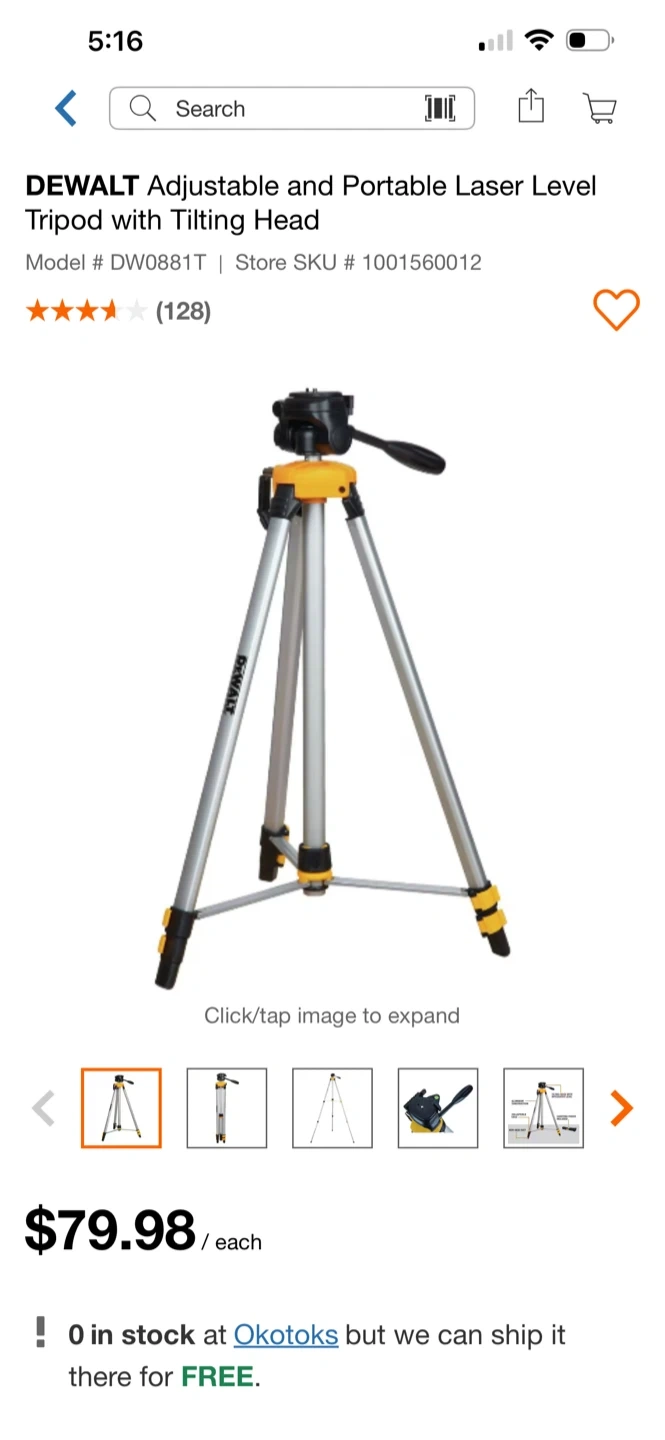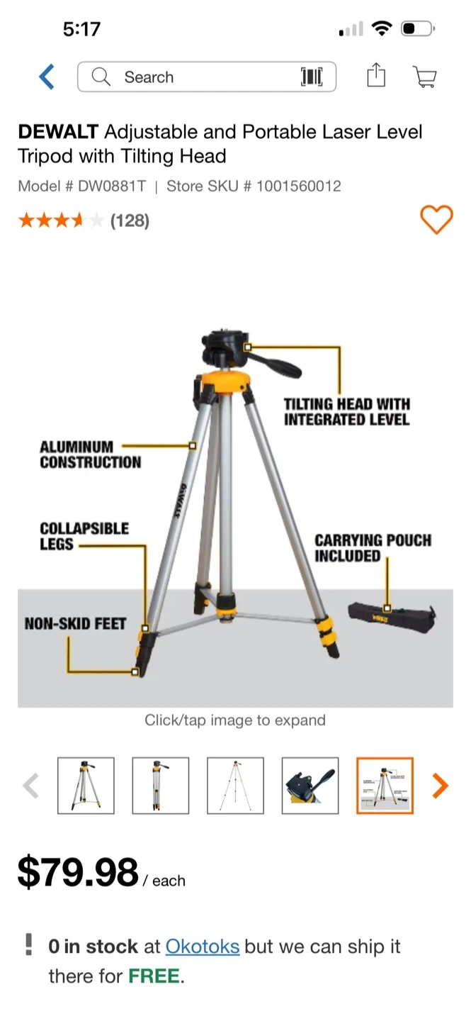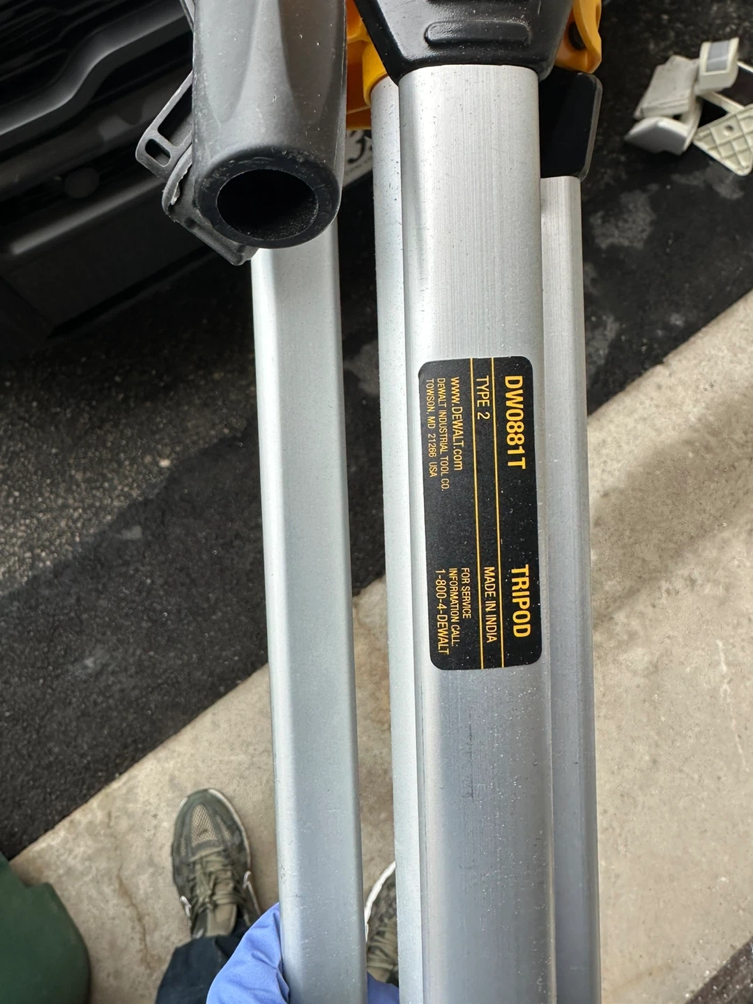 This is a DEWALT DW0881T adjustable and portable laser level tripod with a tilting head. It's made with aluminum construction and has non-skid feet. Collapsible legs for easy storage and transport. Includes a carrying pouch.
