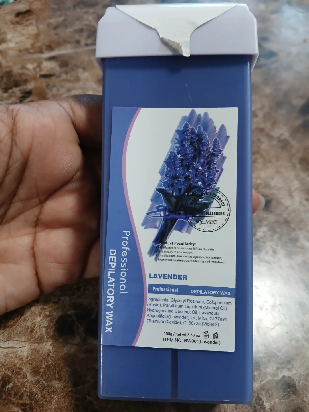This is professional depilatory wax in lavender scent. It's 100g/net wt 3.53 oz. The titanium dioxide in it has a protective texture to prevent continuous reddening and irritation. This wax is steady in any season. Price is firm plz. Pick up midland and Danforth or 401 bay street or stc mall