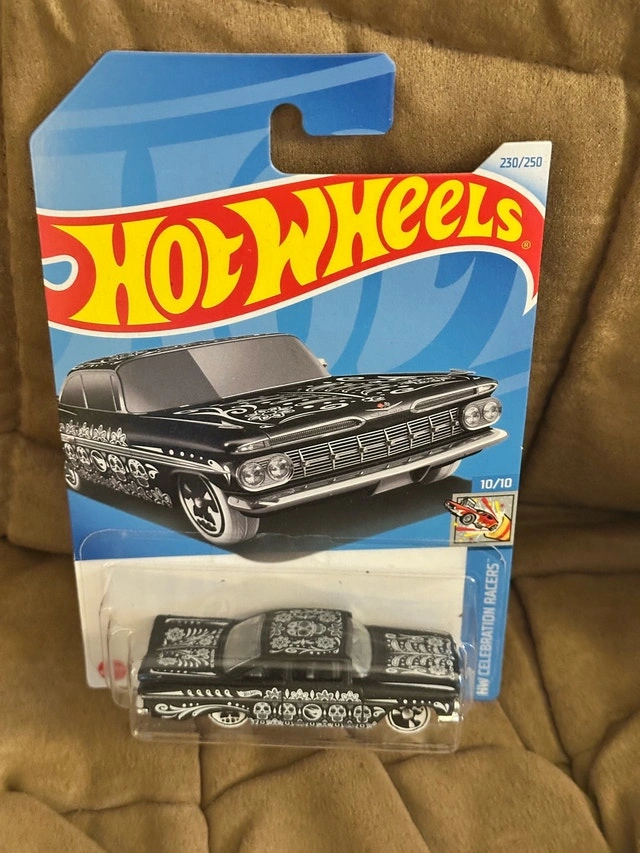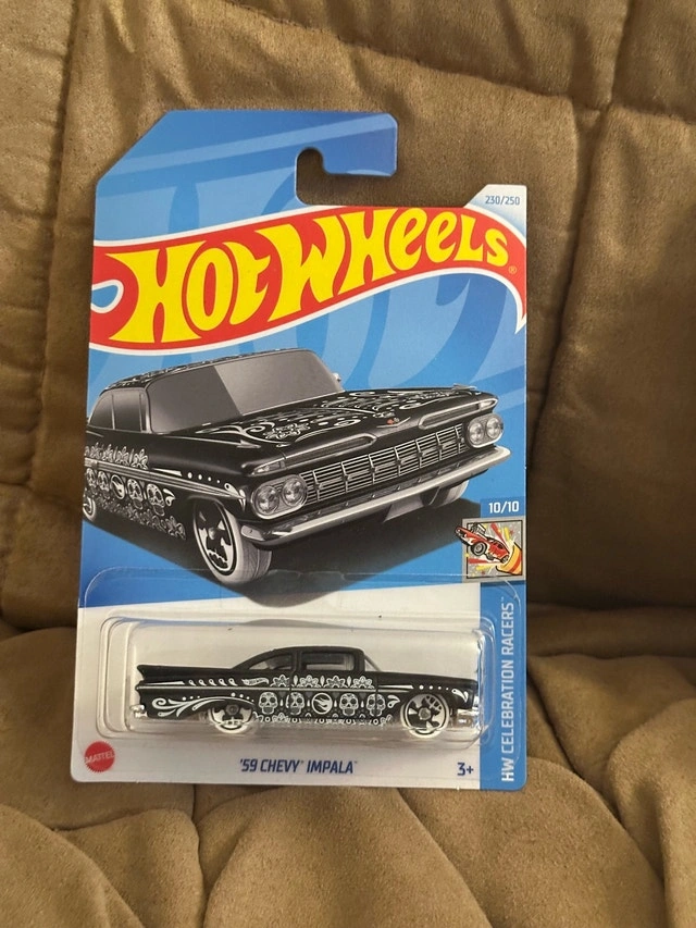 This is a new Hot Wheels '59 Chevy Impala die-cast car, part of the HW Celebration Racers series, number 10/10 and 230/250 in the lineup. It features a unique sugar skulls design. Because it's still sealed in its original packaging, it's in pristine condition and ready to be added to your collection or given as a gift. Here are some specifics: * Series: HW Celebration Racers * Number: 10/10, 230/250 * Design: '59 Chevy Impala with sugar skulls * Condition: New If the ad is up, then it's available. This little gem is waiting for a new home! Cash accepted.