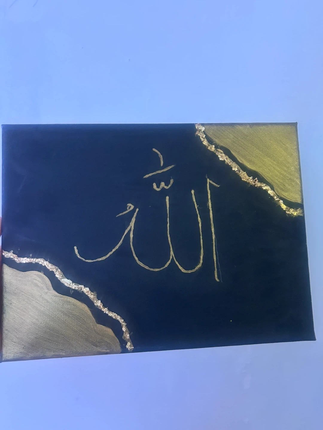 Hand-painted canvas featuring the Arabic word for "Allah" in gold. The design incorporates textured gold leaf accents on a navy blue background. This piece is ready to hang and would complement various decor styles.9X10