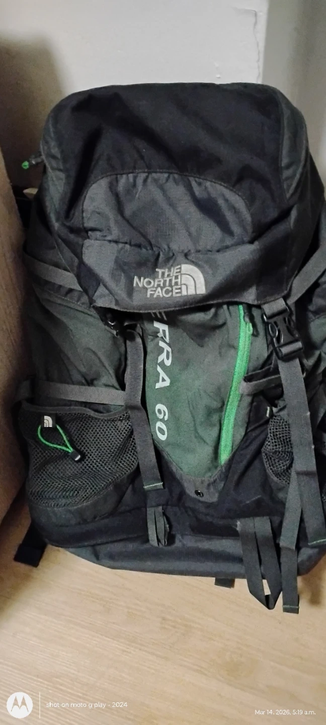 This is a The North Face Terra 60 backpack. It's black and green with multiple pockets and adjustable straps. Perfect for hiking or travel! Please take it off my hands