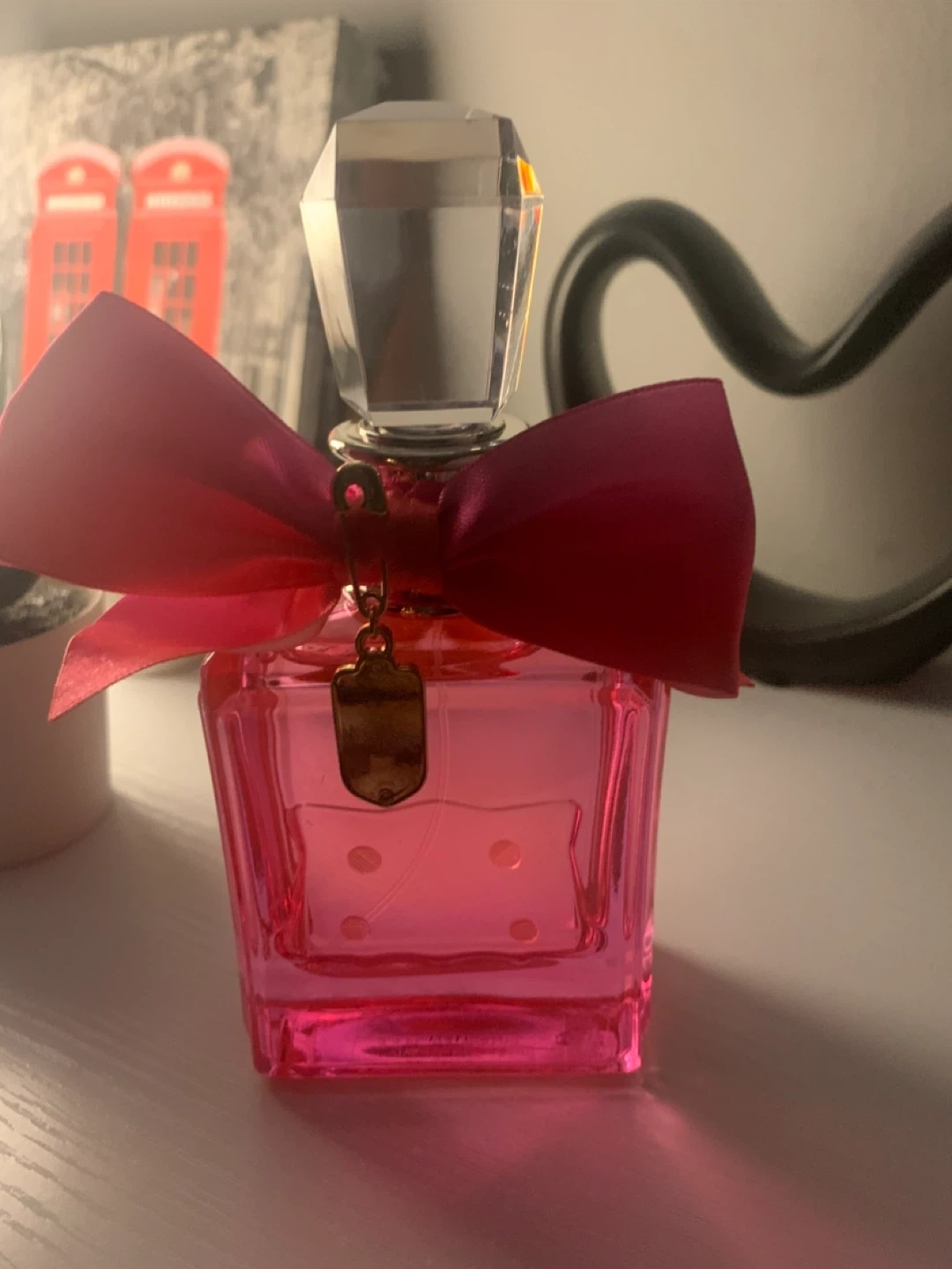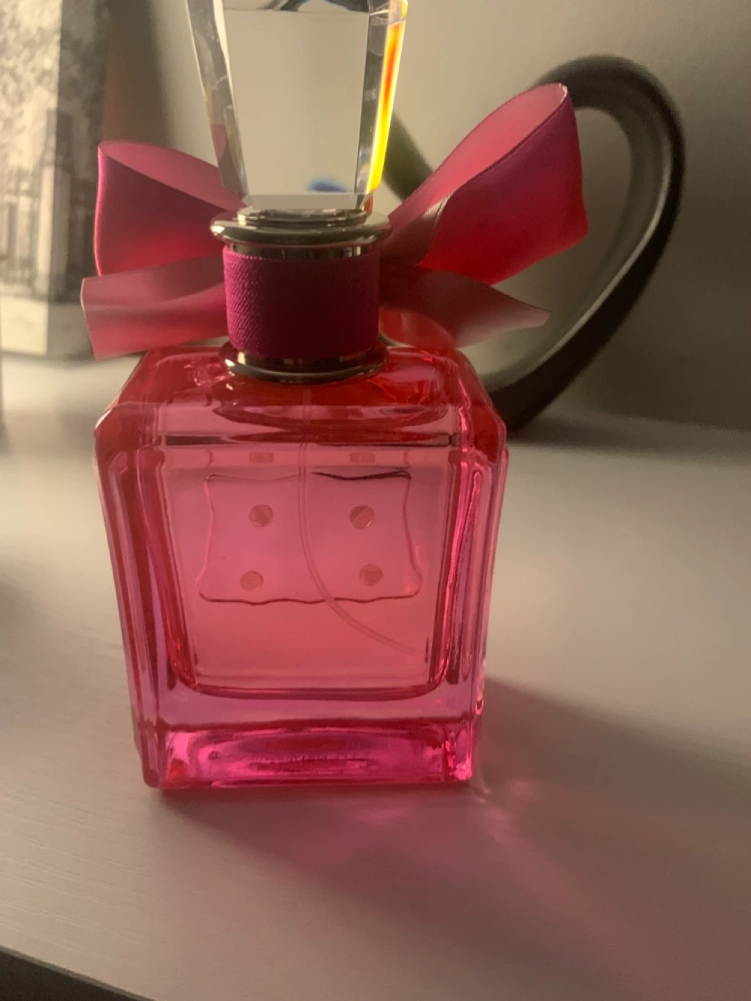 This is a bottle of Juicy Couture Viva la Juicy Eau de Parfum. It's a delightful fruity floral fragrance with top notes of mandarin orange, honeysuckle, and gardenia. The bottle itself is quite pretty, featuring a bright pink hue and a large ribbon bow detail.