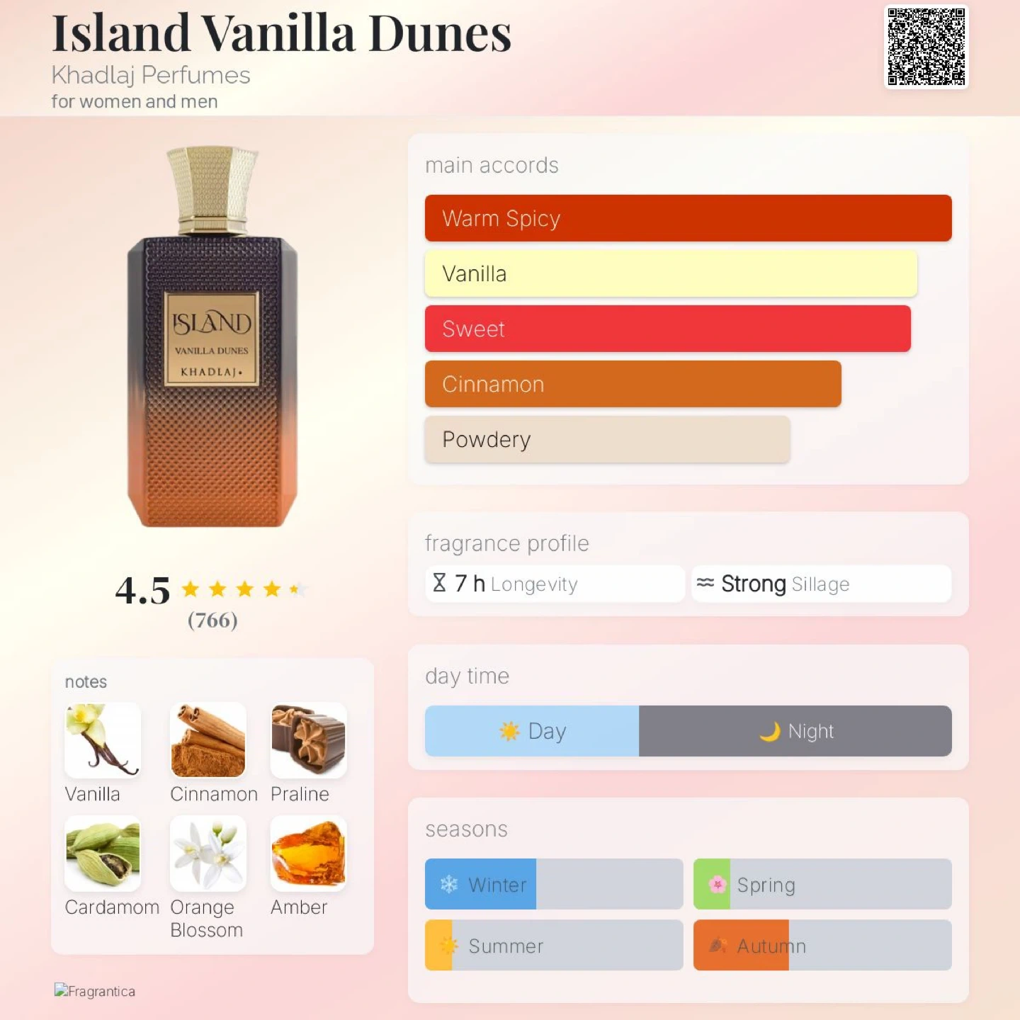 This fragrance features warm, spicy, and sweet accords with vanilla and cinnamon notes. It's a strong scent with good longevity, suitable for cooler seasons. Great for anyone who enjoys a rich, gourmand fragrance!