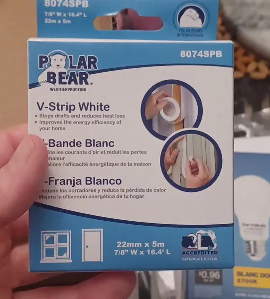 This is Polar Bear V-Strip weatherproofing tape in white. It's 22mm wide and 5 meters long. It stops drafts and reduces heat loss, improving your home's energy efficiency.