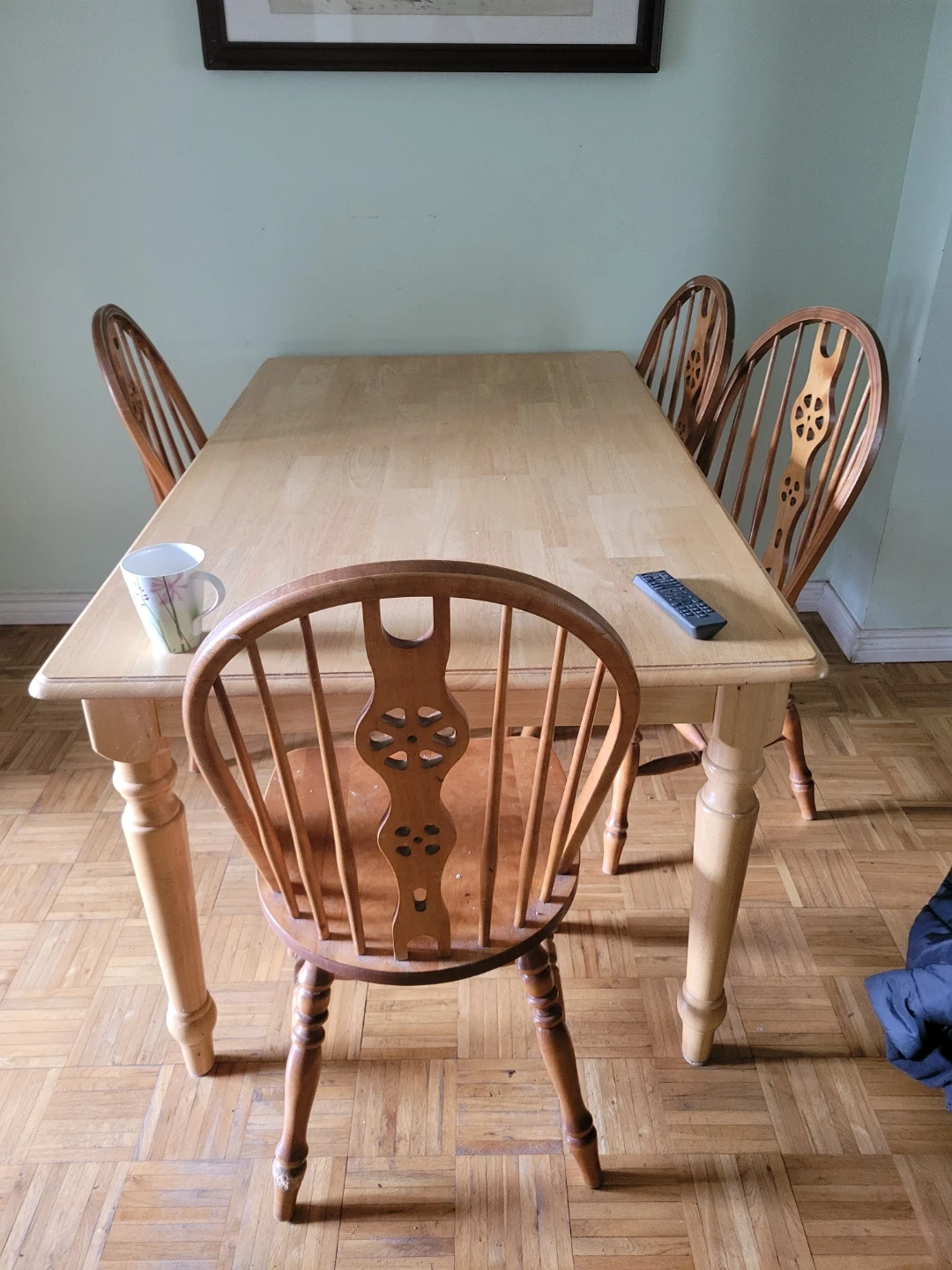 A light-coloured wooden dining table with four matching spindle-back chairs. The chairs have decorative backrests. Table and chairs are made of wood.