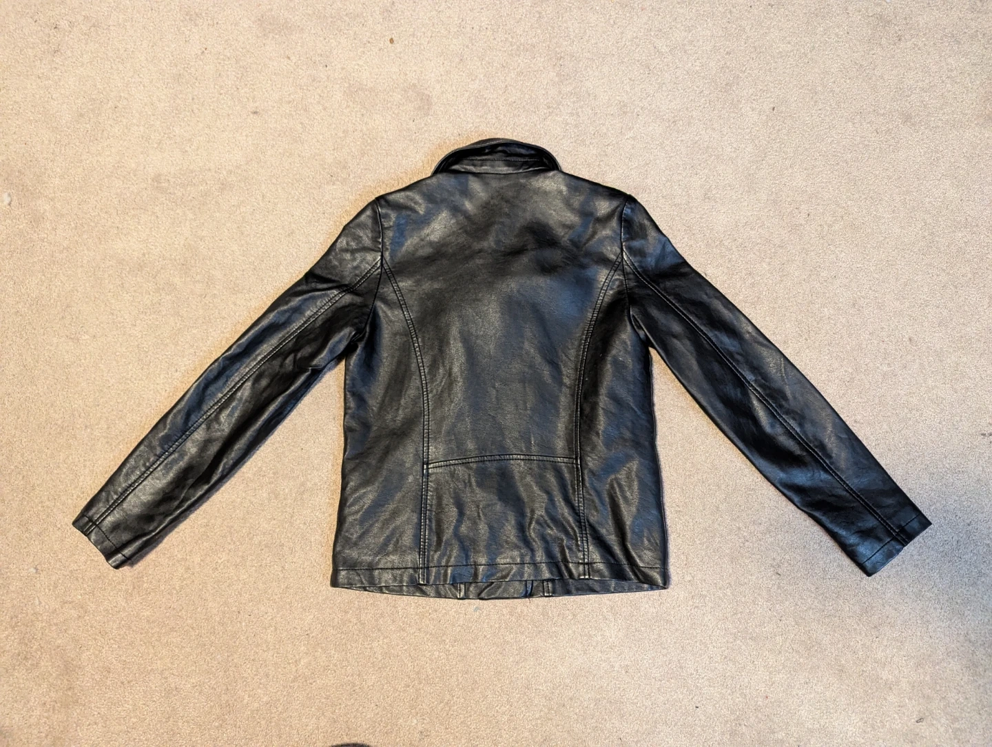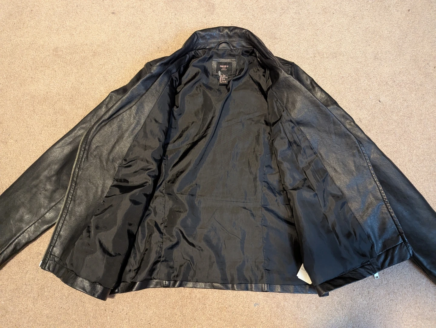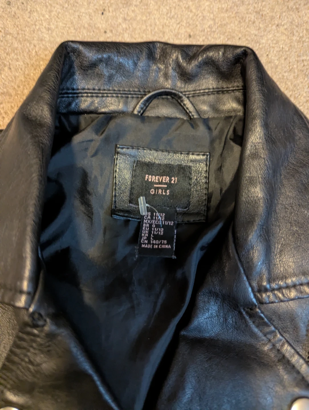 This black faux leather moto jacket is from Forever 21. It's a girls' size 10/12. Fully lined with a zipped front and pockets. In great condition, zippers all intact. Smoke free home. Pick up in Ajax, Westney Heights area.