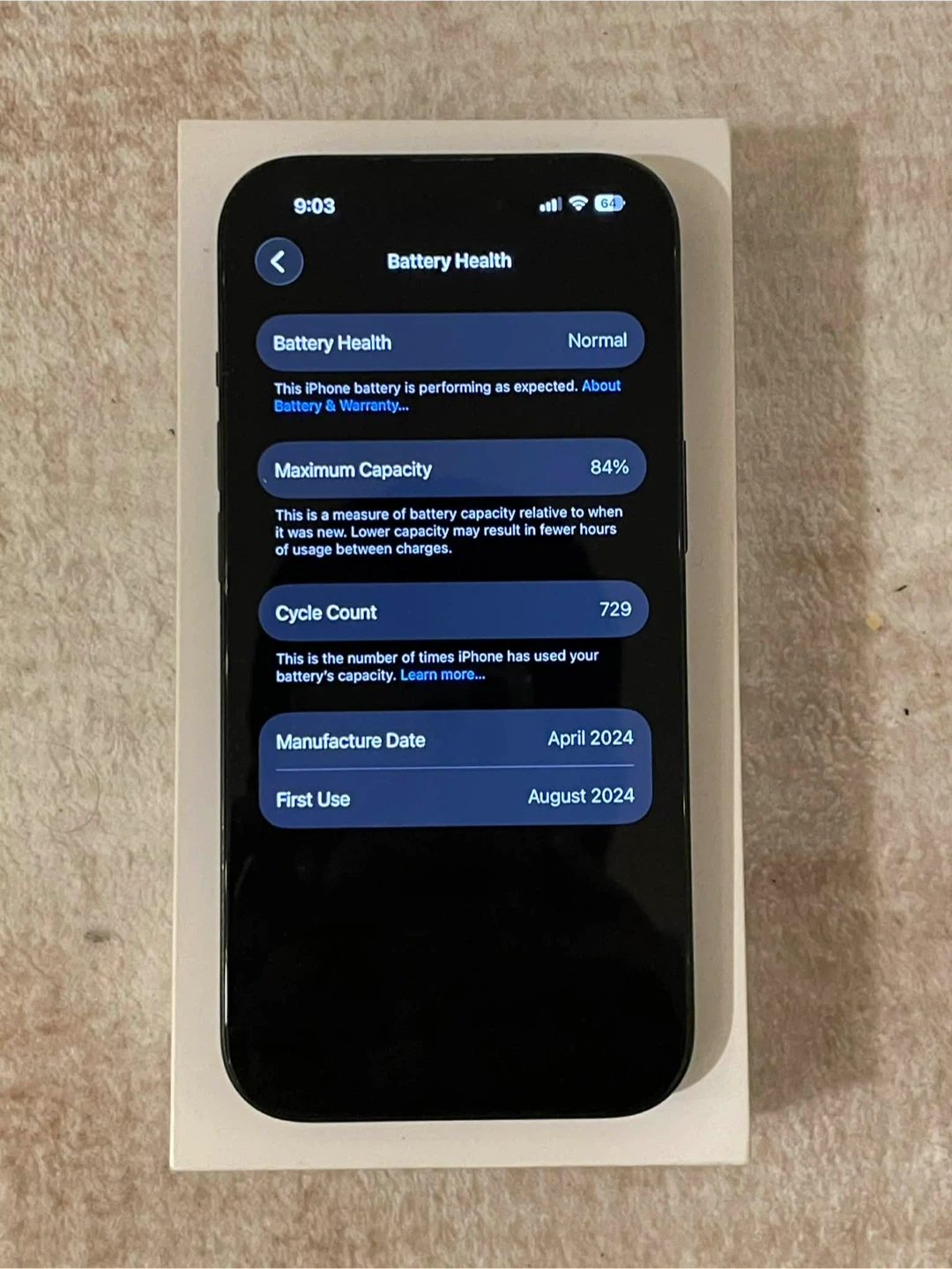 Black iPhone 15 84% battery health 128GB