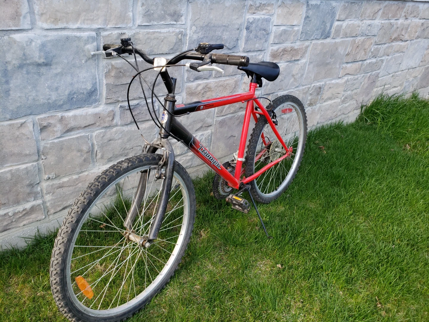 Red and black Triumph mountain bike. This bike is suitable for trails and general riding. It features a durable frame and knobby tires for grip.