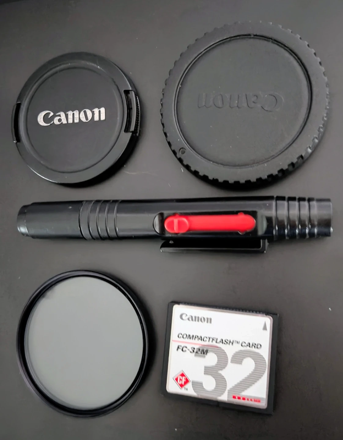 Canon EOS 30D DSLR camera bundled with an EF-S 18-55mm zoom lens. This kit includes lens caps, a Canon CompactFlash card (32GB), and a lens cleaning pen. Perfect for aspiring photographers looking for a reliable entry into digital SLR photography!