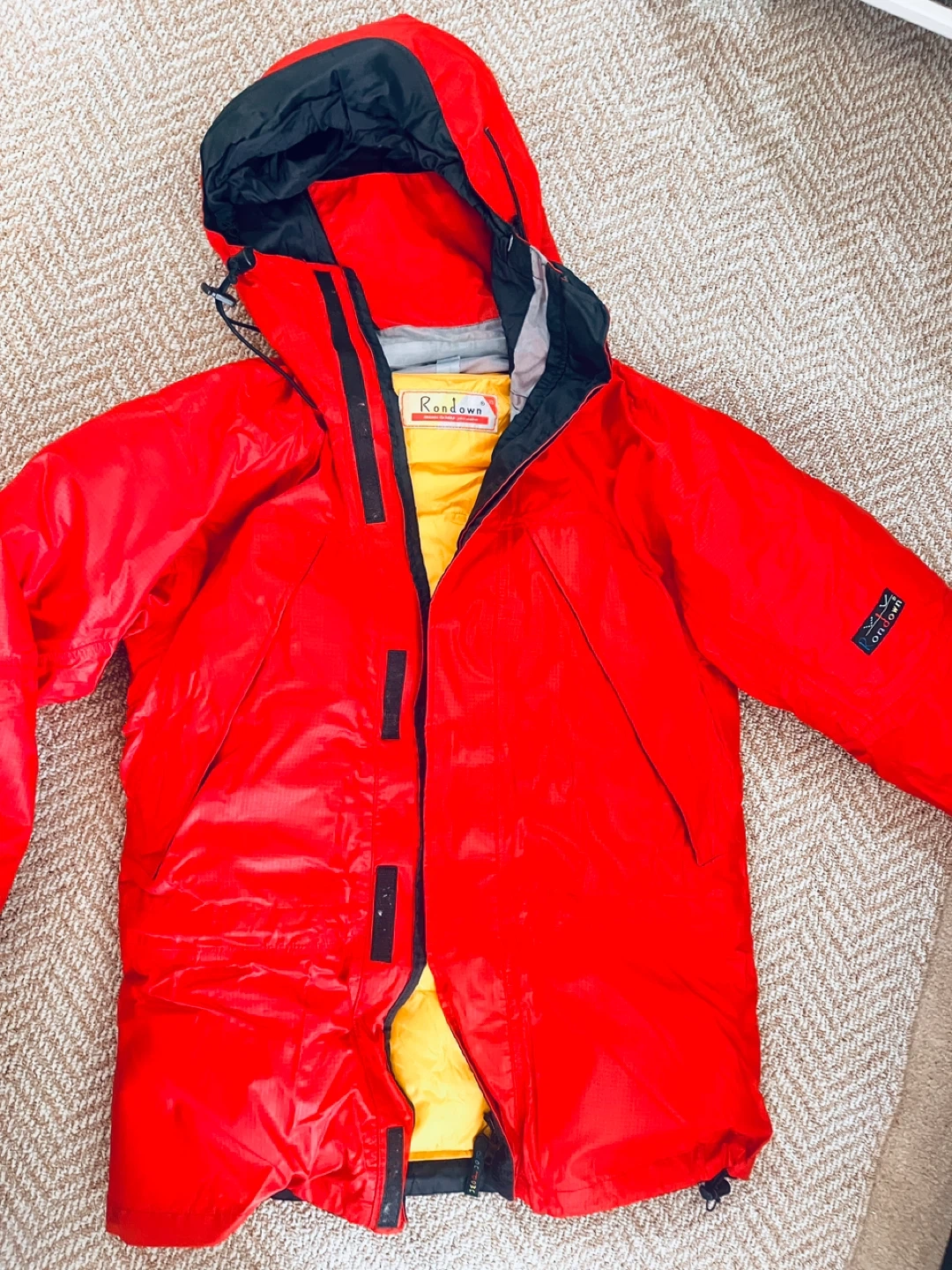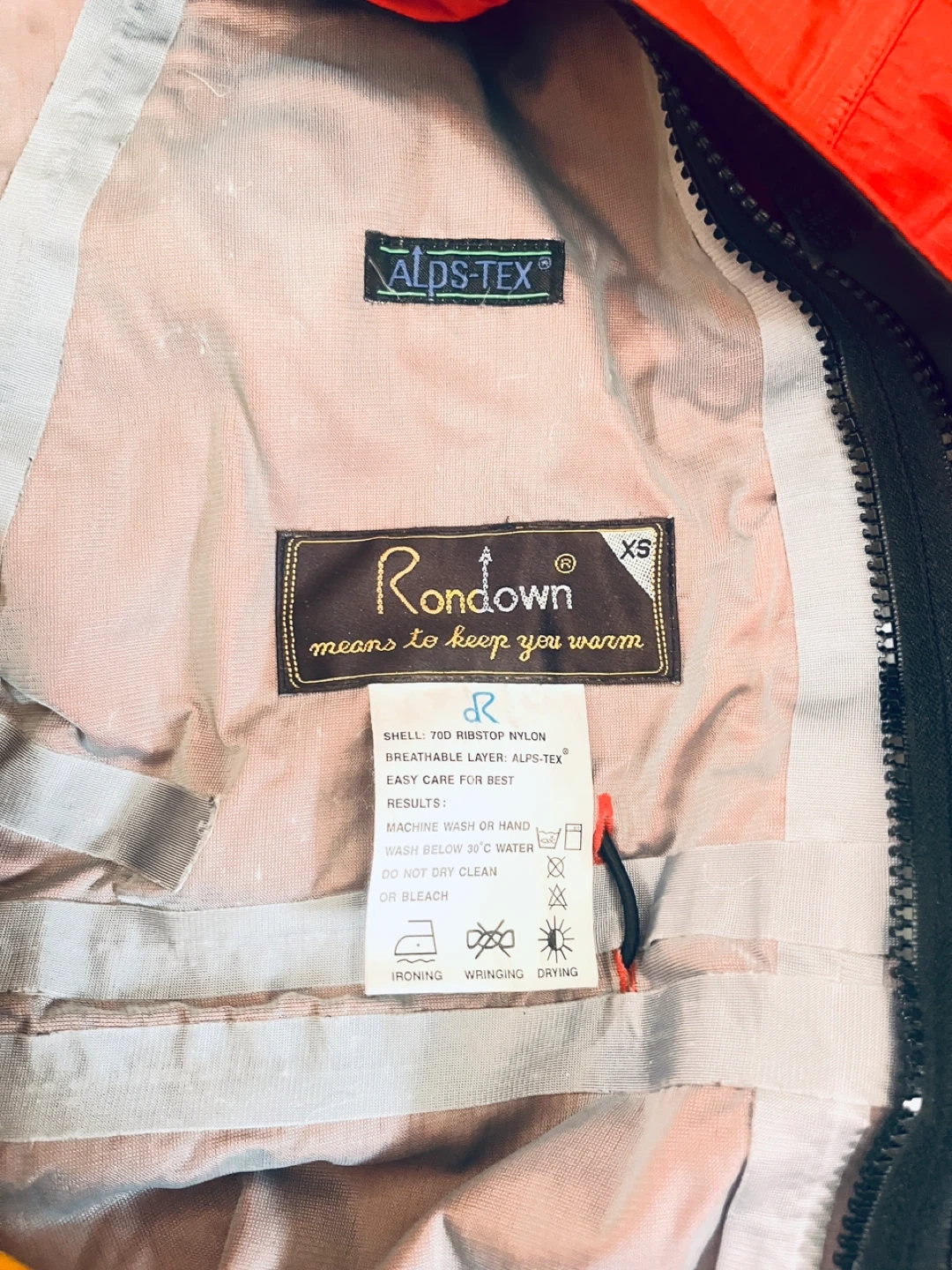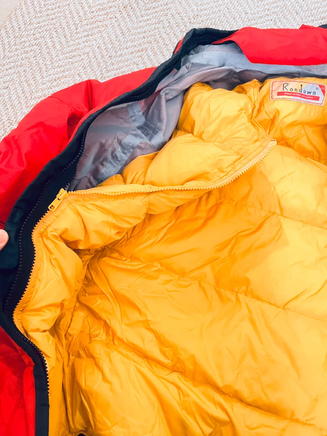 This Rondown jacket is red with a yellow insulated interior. It's made with a 70D ripstop nylon shell and a breathable ALPS-TEX layer. Easy care instructions included for machine washing. It's a great jacket for staying warm!