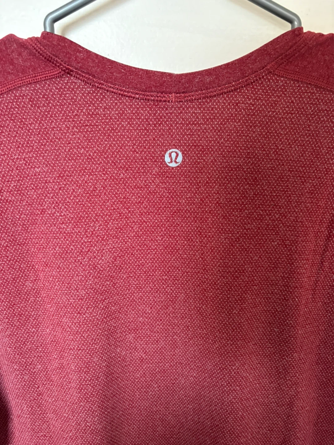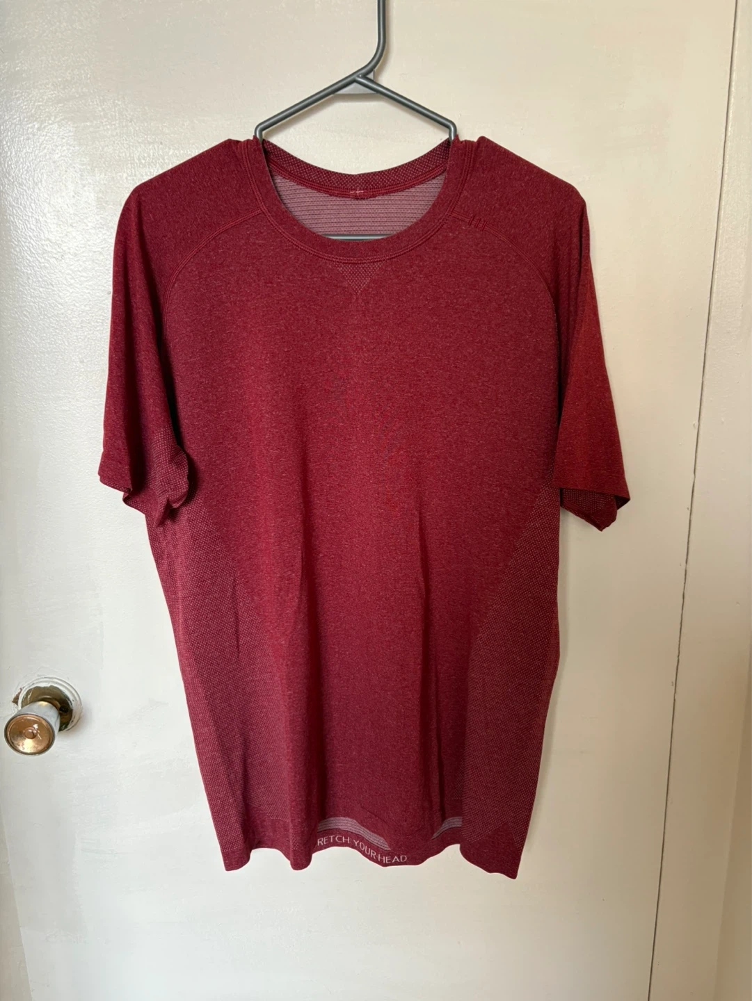 A Lululemon men's short sleeve t-shirt in a deep red colour. Made with a textured, breathable fabric. Perfect for athletic activities or casual wear!