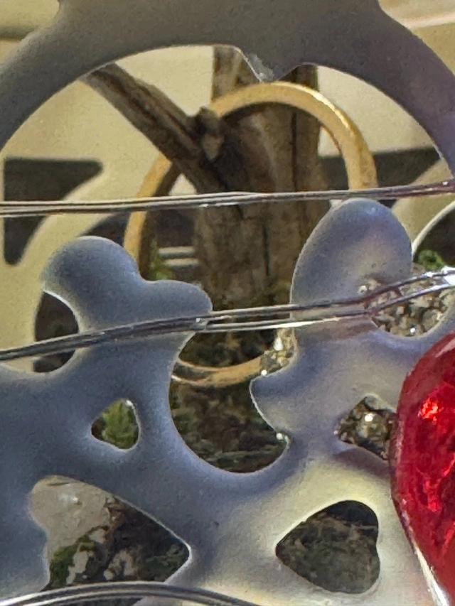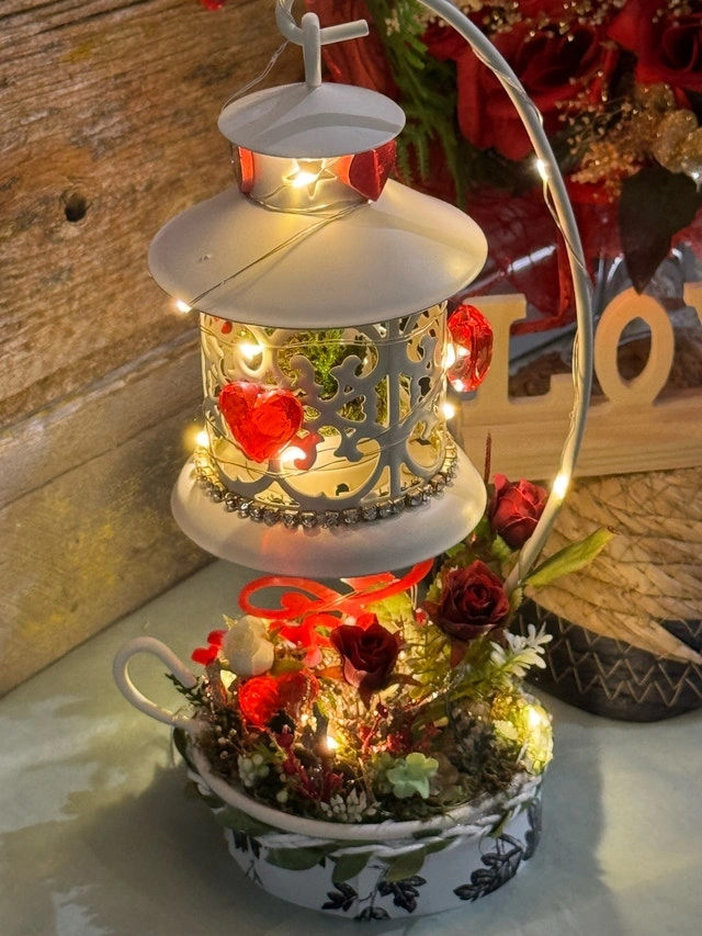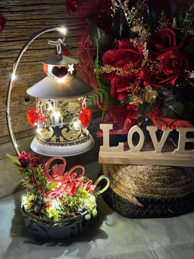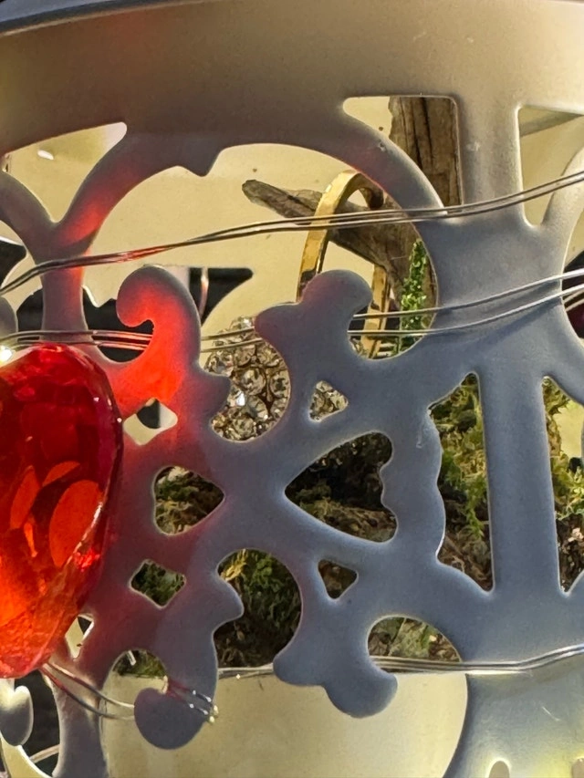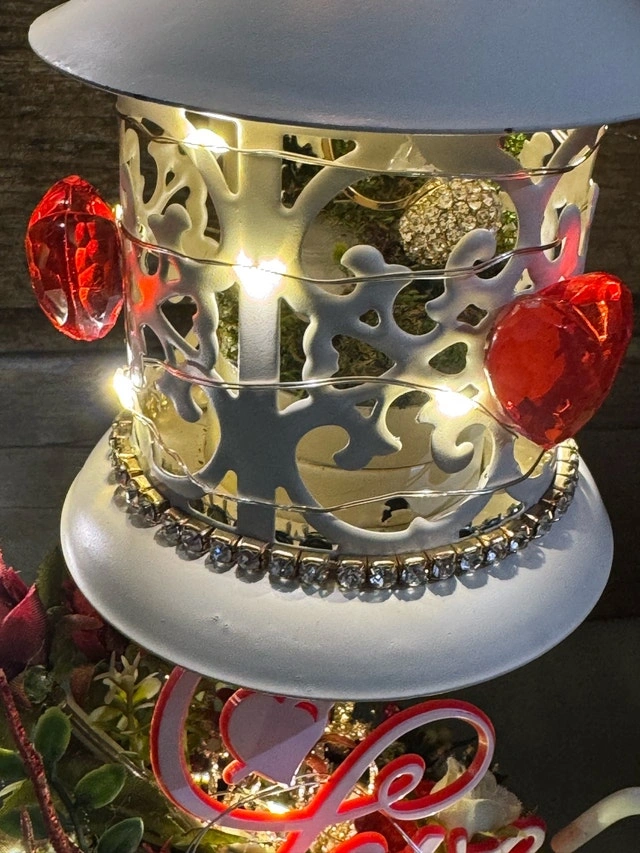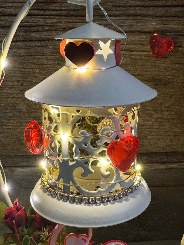 This lovely, one of a kind, unique ring holder features a charming lantern design, perfect for adding a touch of romance to your space. The stand is adorned with delicate lights and the base includes a floral accent with a 'Love' embellishment. The lantern is for showcasing an engagement ring or a ring that says “I Love You“. I’ve used a prop ring for a visual. This would make a beautiful “I Love & Value you”gift! If the ad is up, it's available!