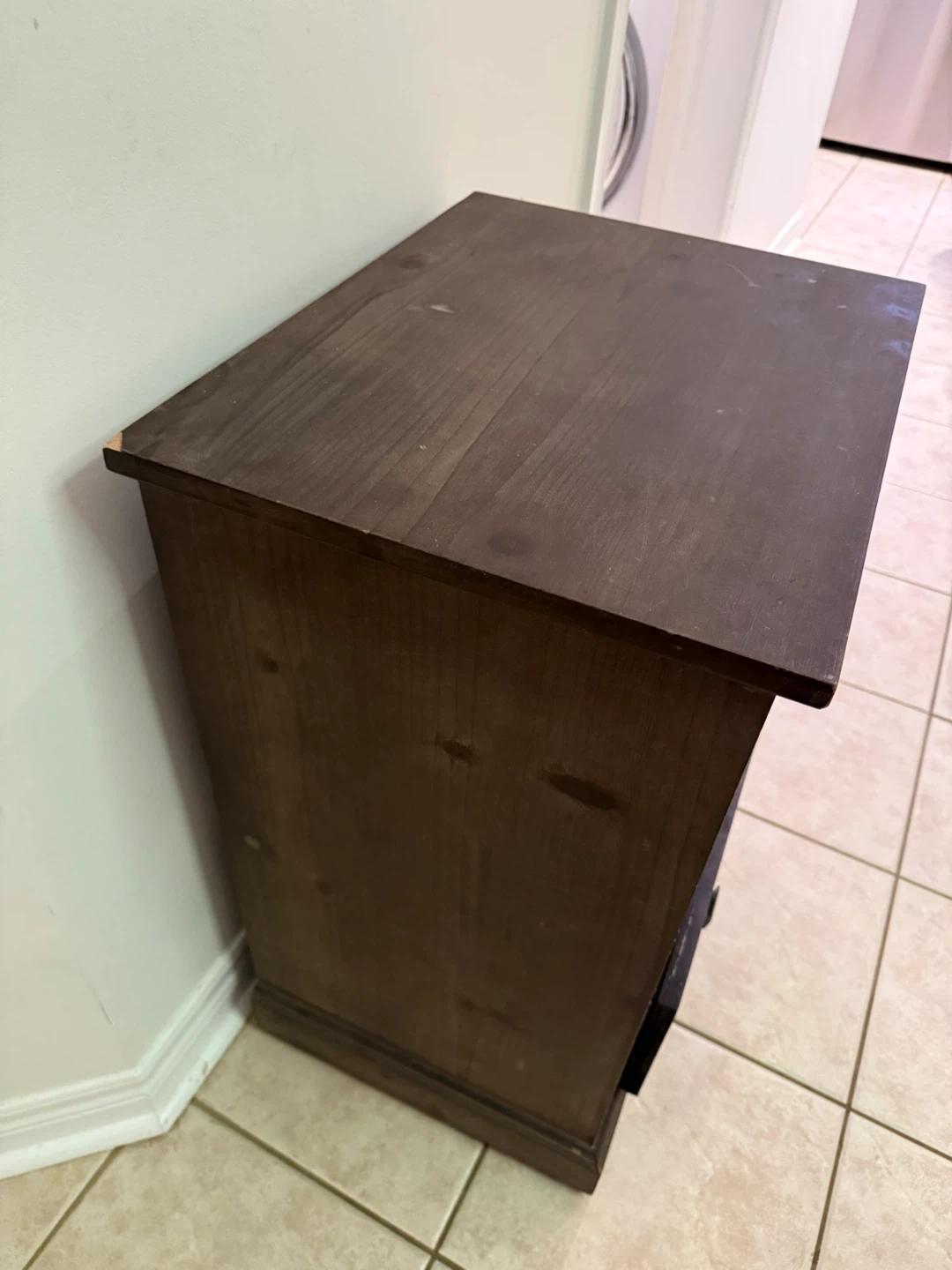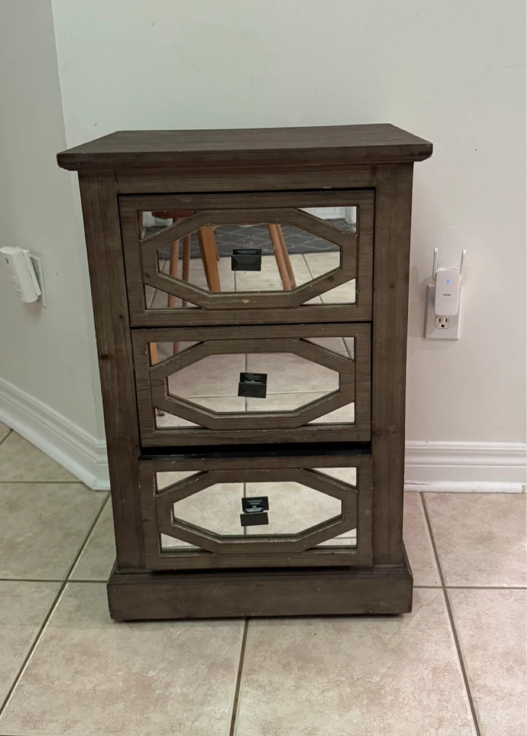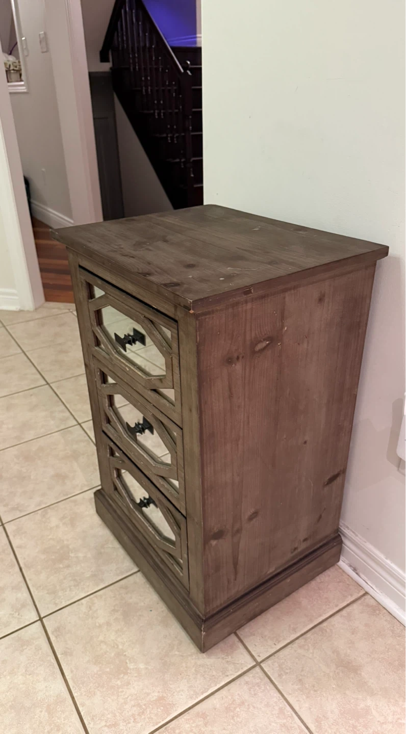 A dark grey/brown accent cabinet with three mirrored drawers. Wood material. Minor wear and tear shown in pictures.