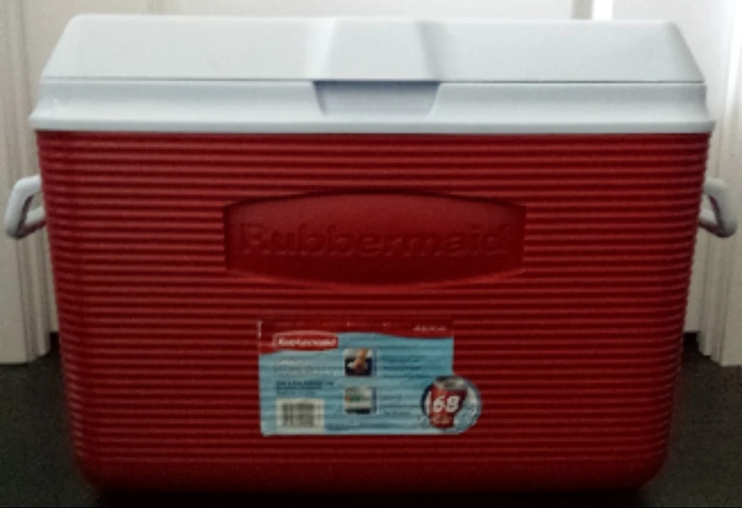 Selling a Rubbermaid cooler in red and white. It's perfect for picnics, camping, or any outdoor event. It's in great condition and ready to keep your drinks and food cold!
