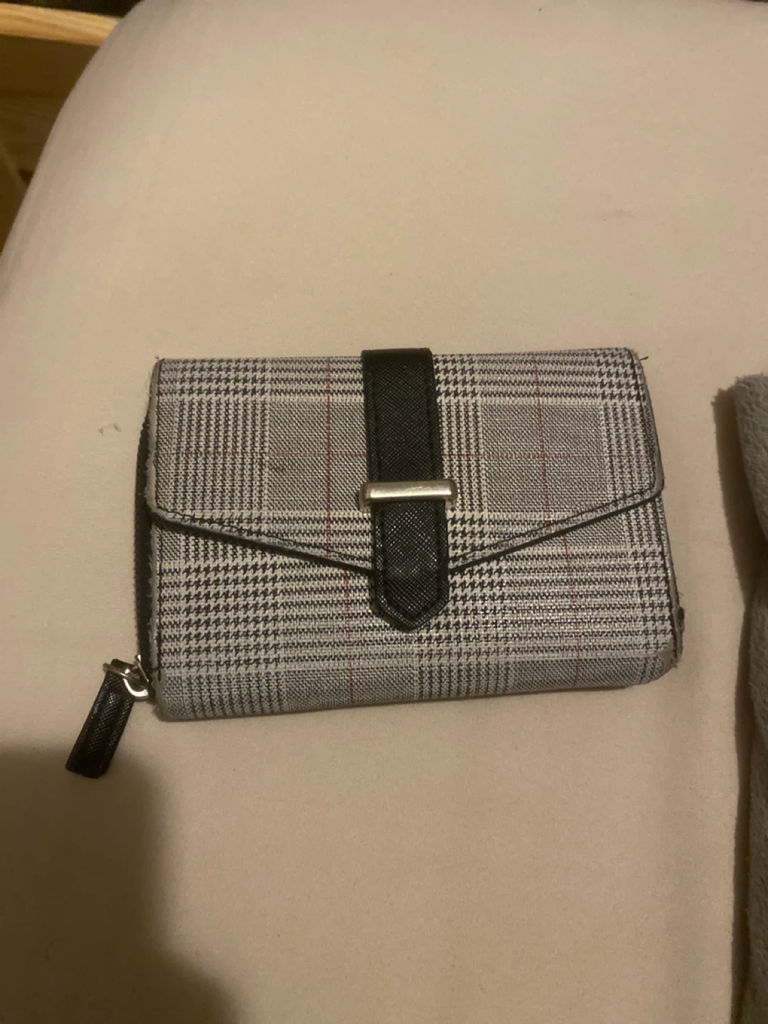 Here's a cute plaid wallet with a black accent strap! It's got a zippered closure and plenty of space inside for your cards and cash. It's in good condition and ready for a new owner!