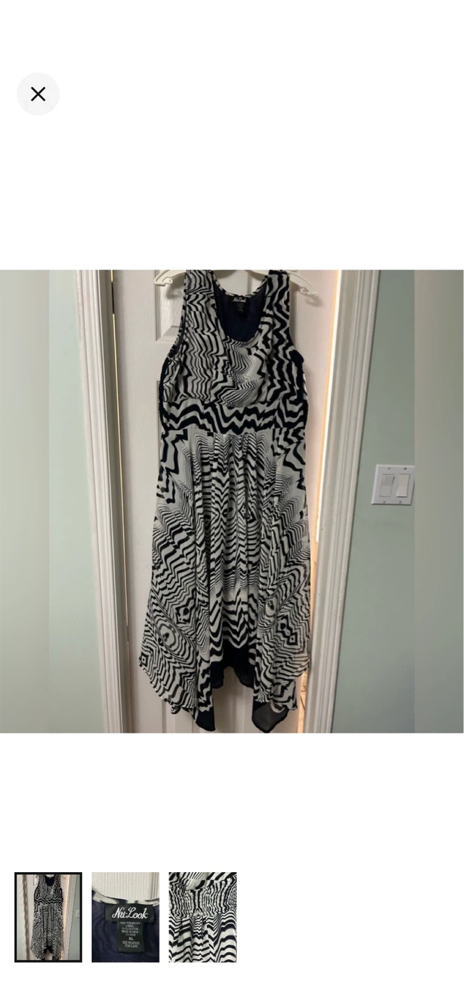 Sleeveless midi dress with a bold black and white abstract print. It's a flowy handkerchief hem style. Made with a blend of polyester and cotton.
