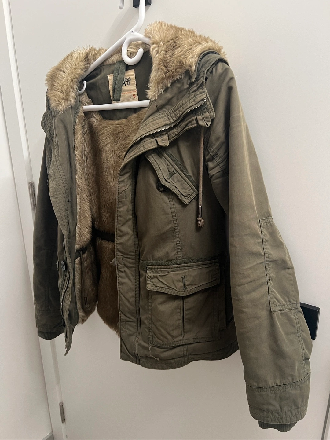 Olive green jacket. Faux fur lined hood and interior. Size small. Pockets. Zipper and button closure.