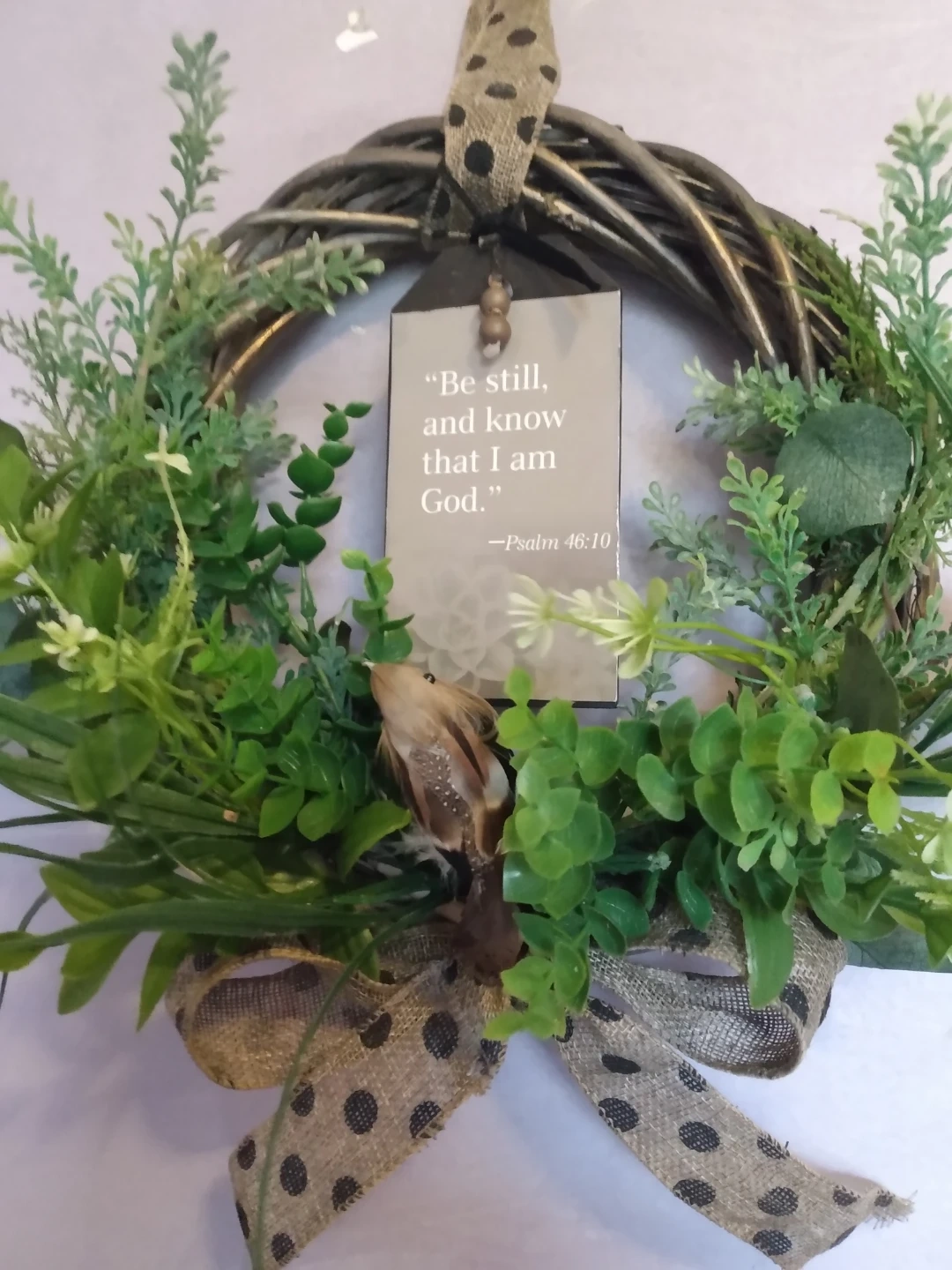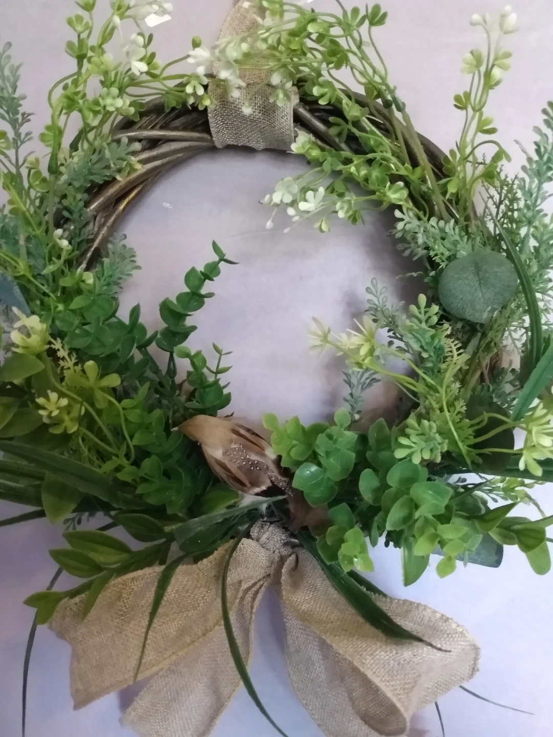 A lovely spring wreath featuring an assortment of greenery, small white flowers, and a decorative bird. It's finished with a burlap bow at the bottom and a burlap loop for hanging. This wreath adds a cheerful touch to any doorway or wall!